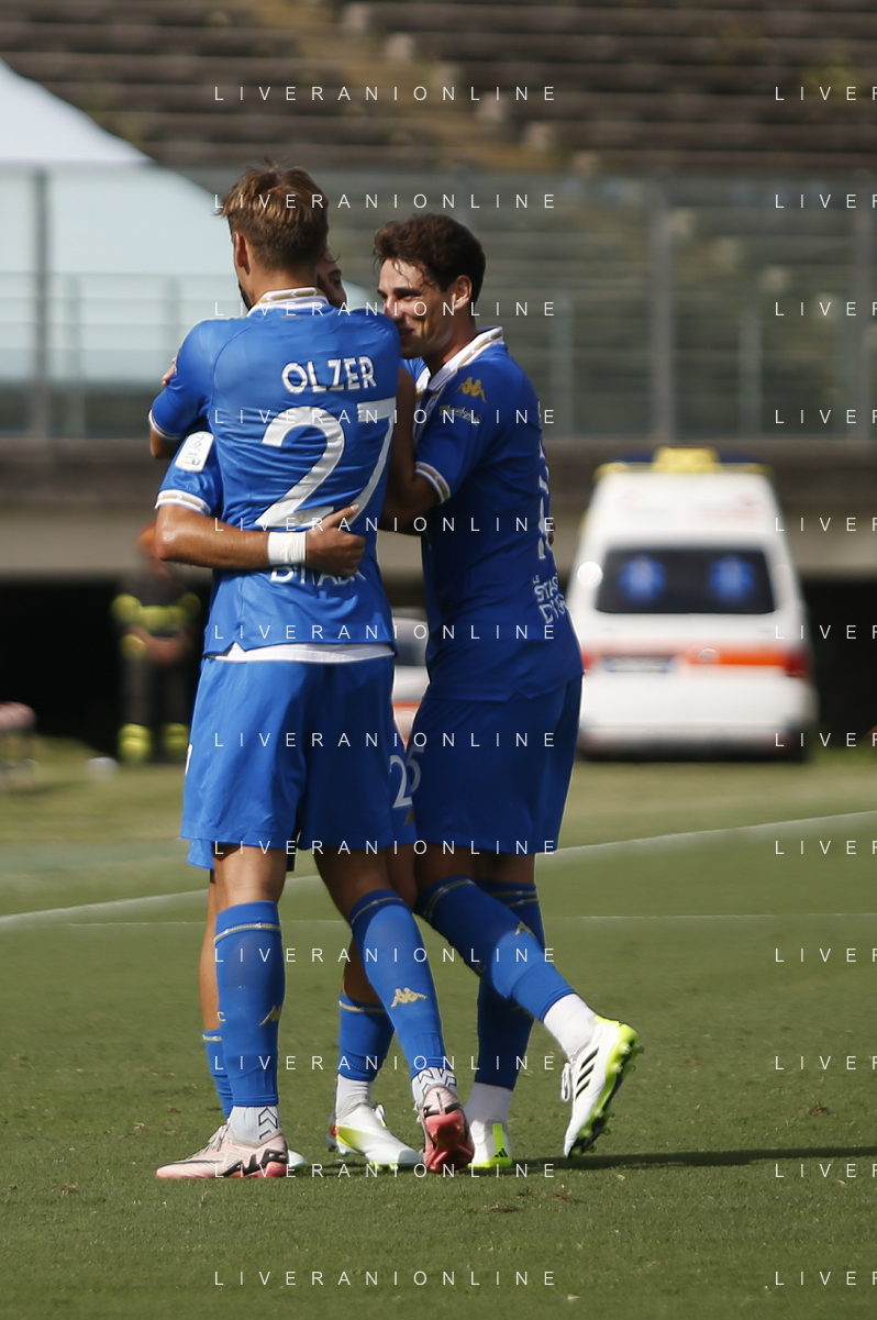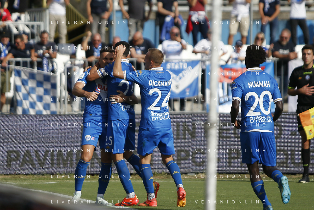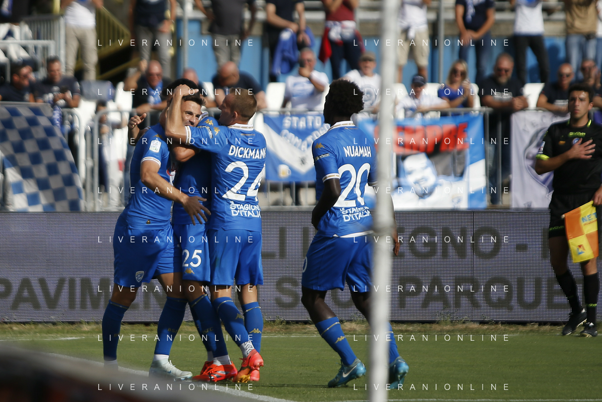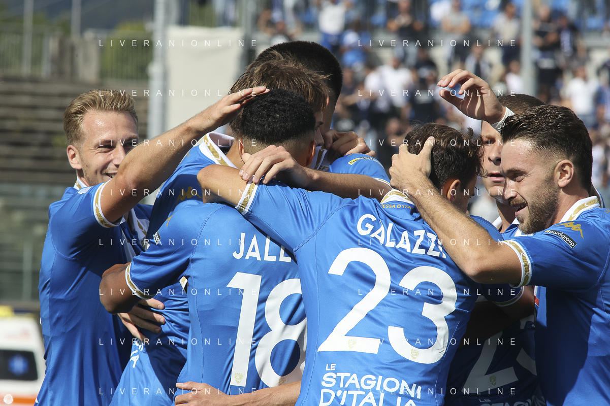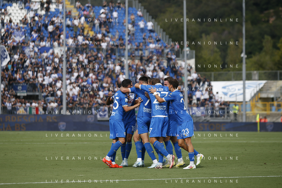 Giacomo Olzer of Brescia Calcio FC and Brescia players jubilates after scoring the goal during Brescia Calcio vs Frosinone Calcio, 5° Serie B BKT 2024-25 game at Mario Rigamonti stadium in Brescia (BS), Italy, on September 14, 2024. (Photo by Davide Casentini) ag aldo liverai sas