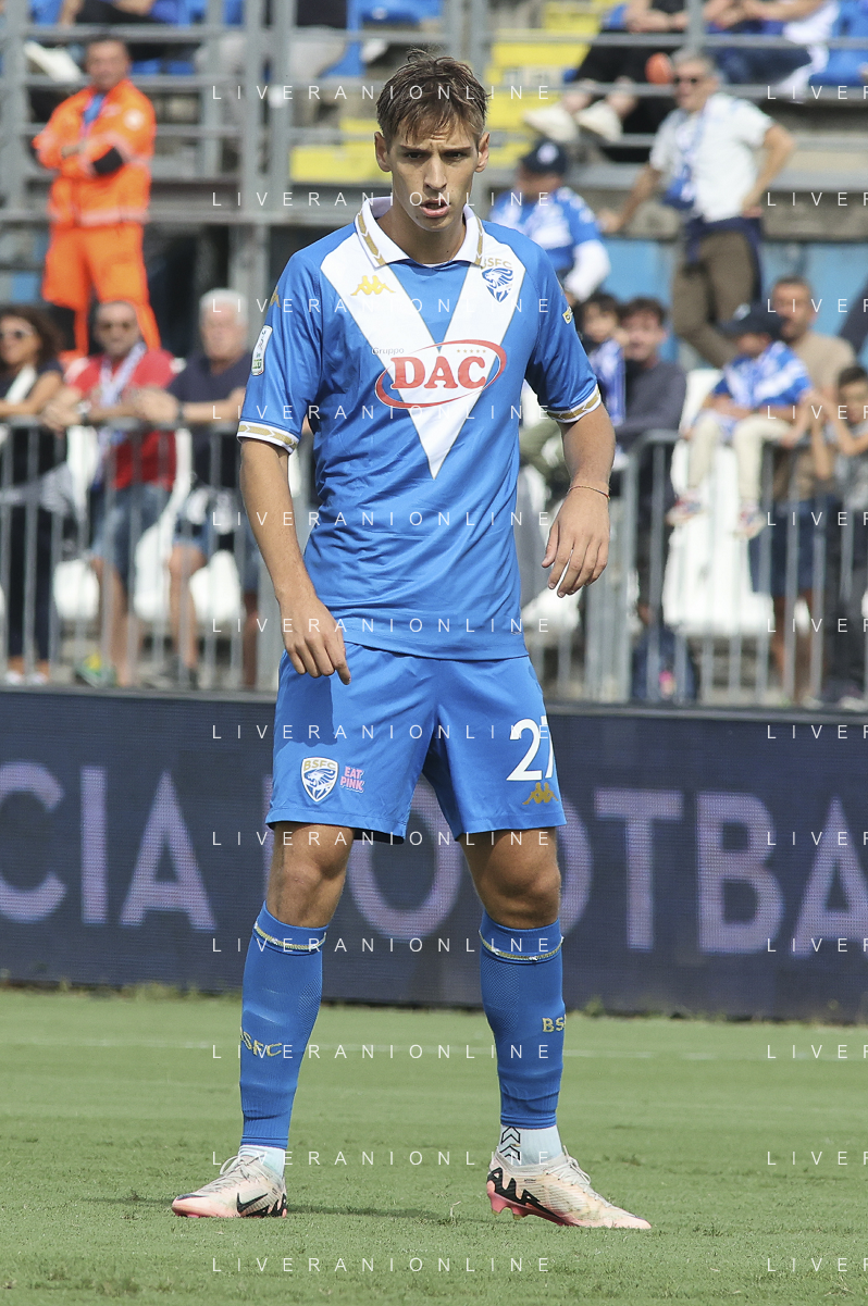 Giacomo Olzer of Brescia Calcio FC during Brescia Calcio vs Frosinone Calcio, 5° Serie B BKT 2024-25 game at Mario Rigamonti stadium in Brescia (BS), Italy, on September 14, 2024. (Photo by Davide Casentini) ag aldo liverai sas