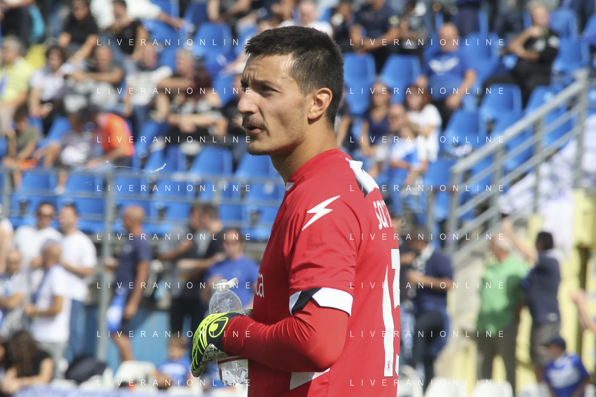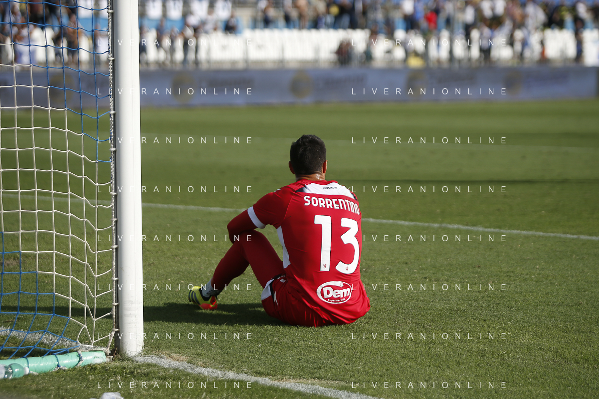 Alessandro Sorrentino of Frosinone Calcio expresses disappointment during Brescia Calcio vs Frosinone Calcio, 5° Serie B BKT 2024-25 game at Mario Rigamonti stadium in Brescia (BS), Italy, on September 14, 2024. (Photo by Davide Casentini) ag aldo liverai sas