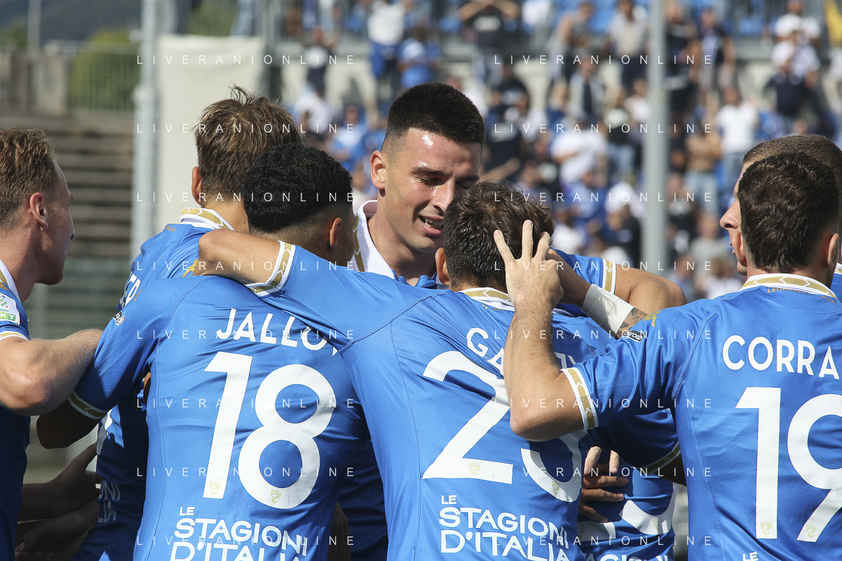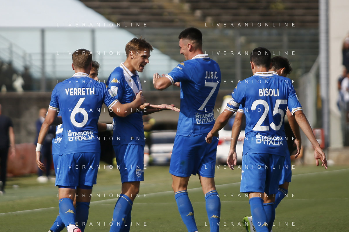 Ante Matej Juric of Brescia Calcio FC and Brescia players jubilates after scoring the goal first goal during Brescia Calcio vs Frosinone Calcio, 5° Serie B BKT 2024-25 game at Mario Rigamonti stadium in Brescia (BS), Italy, on September 14, 2024. (Photo by Davide Casentini) ag aldo liverai sas