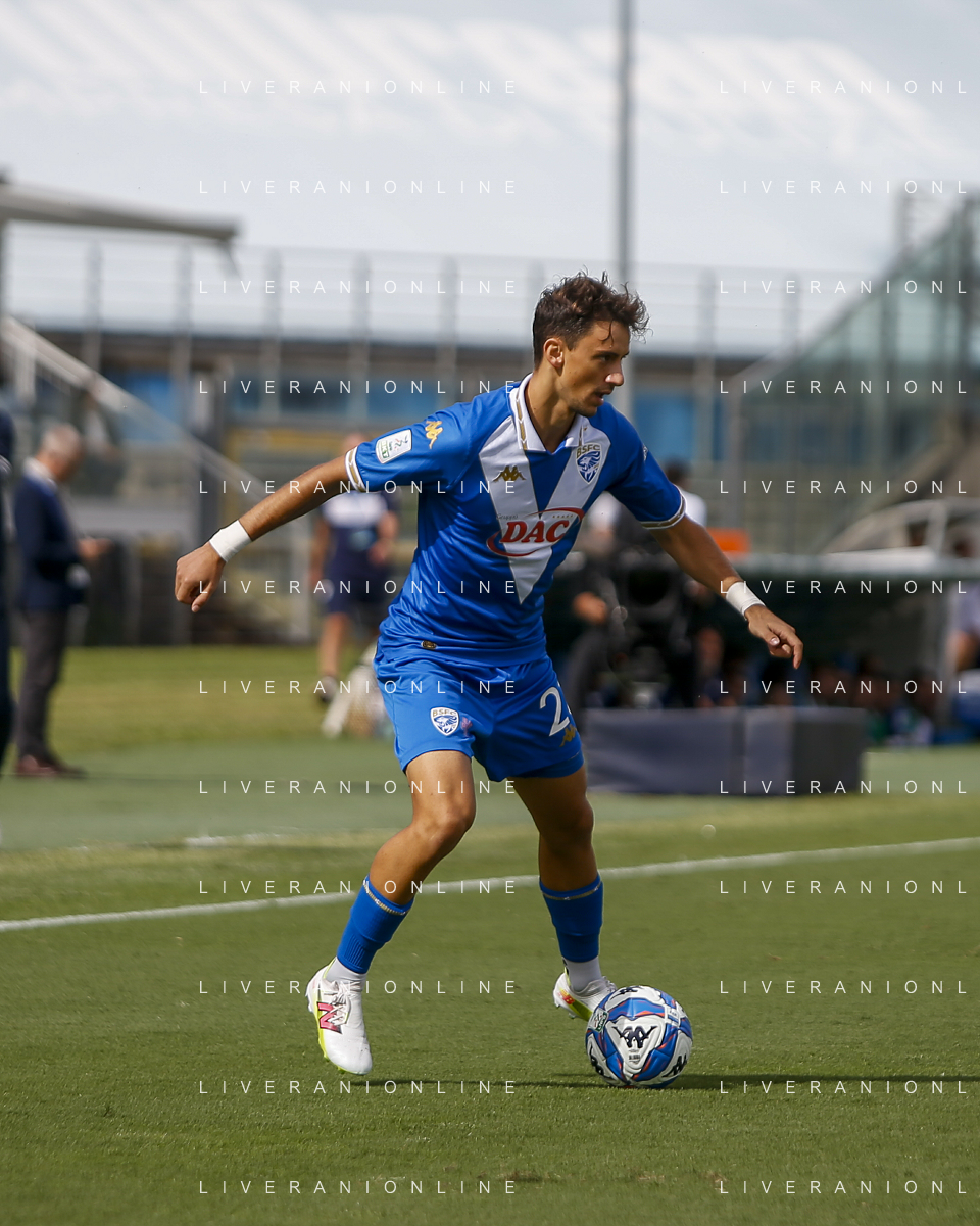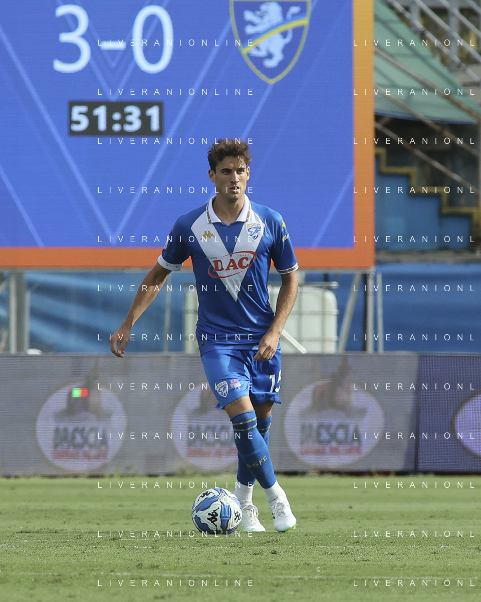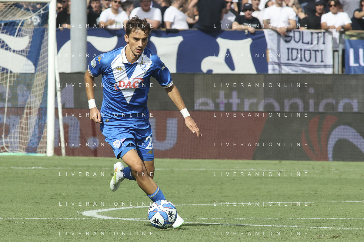 Niccolò Corrado of Brescia Calcio FC play the ball during Brescia Calcio vs Frosinone Calcio, 5° Serie B BKT 2024-25 game at Mario Rigamonti stadium in Brescia (BS), Italy, on September 14, 2024. (Photo by Davide Casentini) ag aldo liverai sas