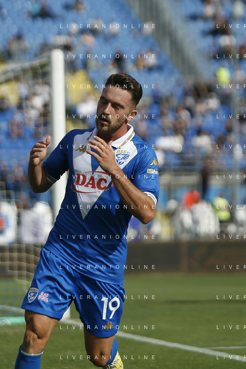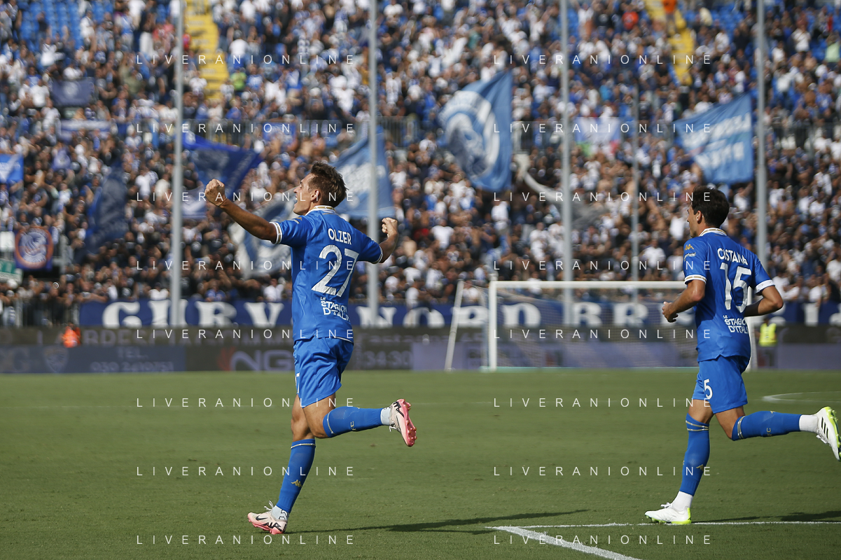 Giacomo Olzer of Brescia Calcio FC celebrates after scoring during Brescia Calcio vs Frosinone Calcio, 5° Serie B BKT 2024-25 game at Mario Rigamonti stadium in Brescia (BS), Italy, on September 14, 2024. (Photo by Davide Casentini) ag aldo liverai sas
