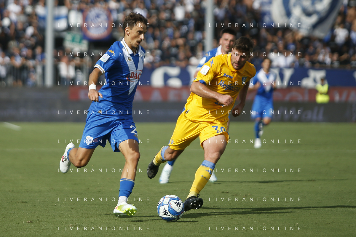 Nicolas Galazzi of Brescia Calcio FC competes for the ball with Gabriele Bracaglia of Frosinone Calcio during Brescia Calcio vs Frosinone Calcio, 5° Serie B BKT 2024-25 game at Mario Rigamonti stadium in Brescia (BS), Italy, on September 14, 2024. (Photo by Davide Casentini) ag aldo liverai sas