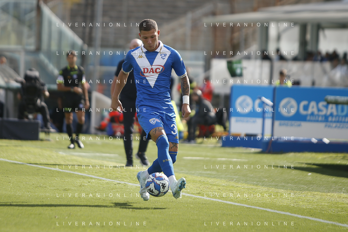 Davide Adorni of Brescia Calcio FC play the ball during Brescia Calcio vs Frosinone Calcio, 5° Serie B BKT 2024-25 game at Mario Rigamonti stadium in Brescia (BS), Italy, on September 14, 2024. (Photo by Davide Casentini) ag aldo liverai sas