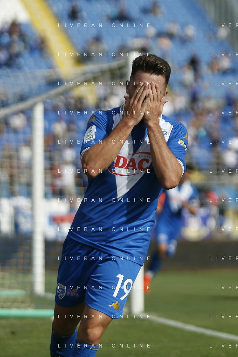 Niccolò Corrado of Brescia Calcio FC expresses disappointment during Brescia Calcio vs Frosinone Calcio, 5° Serie B BKT 2024-25 game at Mario Rigamonti stadium in Brescia (BS), Italy, on September 14, 2024. (Photo by Davide Casentini) ag aldo liverai sas