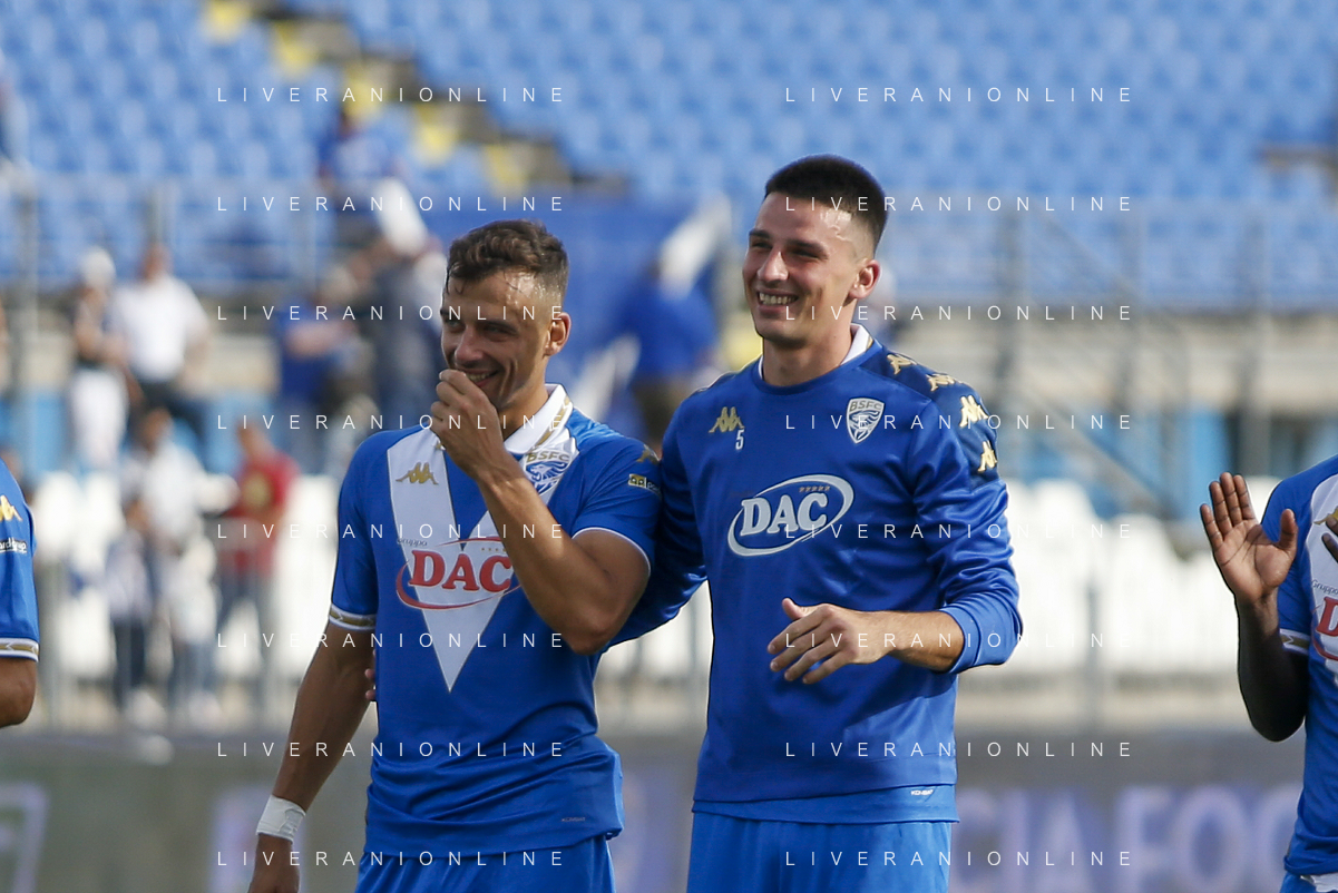 Davide Adorni of Brescia Calcio FC and Ante Matej Juric of Brescia Calcio FC at the end of Brescia Calcio vs Frosinone Calcio, 5° Serie B BKT 2024-25 game at Mario Rigamonti stadium in Brescia (BS), Italy, on September 14, 2024. (Photo by Davide Casentini) ag aldo liverai sas