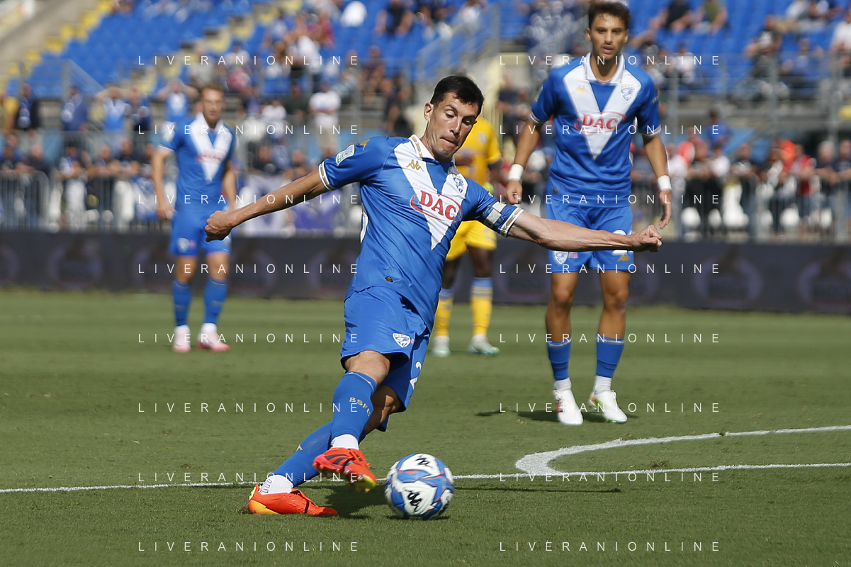 Nicolas Galazzi of Brescia Calcio FC kick the ball during Brescia Calcio vs Frosinone Calcio, 5° Serie B BKT 2024-25 game at Mario Rigamonti stadium in Brescia (BS), Italy, on September 14, 2024. (Photo by Davide Casentini)/AGENZIA ALDO LIVERANI SAS