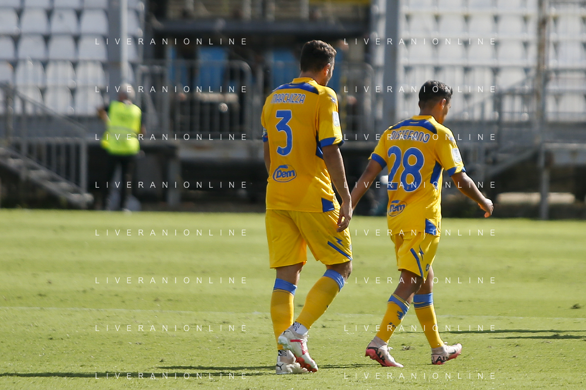 Riccardo Marchizza of Frosinone Calcio and Filippo Distefano of Frosinone Calcio expresses disappointment during Brescia Calcio vs Frosinone Calcio, 5° Serie B BKT 2024-25 game at Mario Rigamonti stadium in Brescia (BS), Italy, on September 14, 2024. (Photo by Davide Casentini)/AGENZIA ALDO LIVERANI SAS
