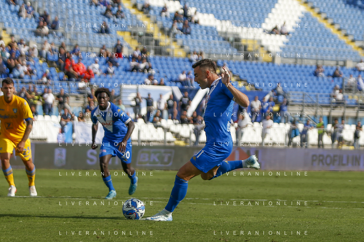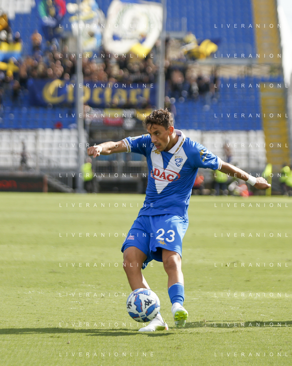Ilario Monterisi of Frosinone Calcio kick the ball during Brescia Calcio vs Frosinone Calcio, 5° Serie B BKT 2024-25 game at Mario Rigamonti stadium in Brescia (BS), Italy, on September 14, 2024. (Photo by Davide Casentini)/AGENZIA ALDO LIVERANI SAS