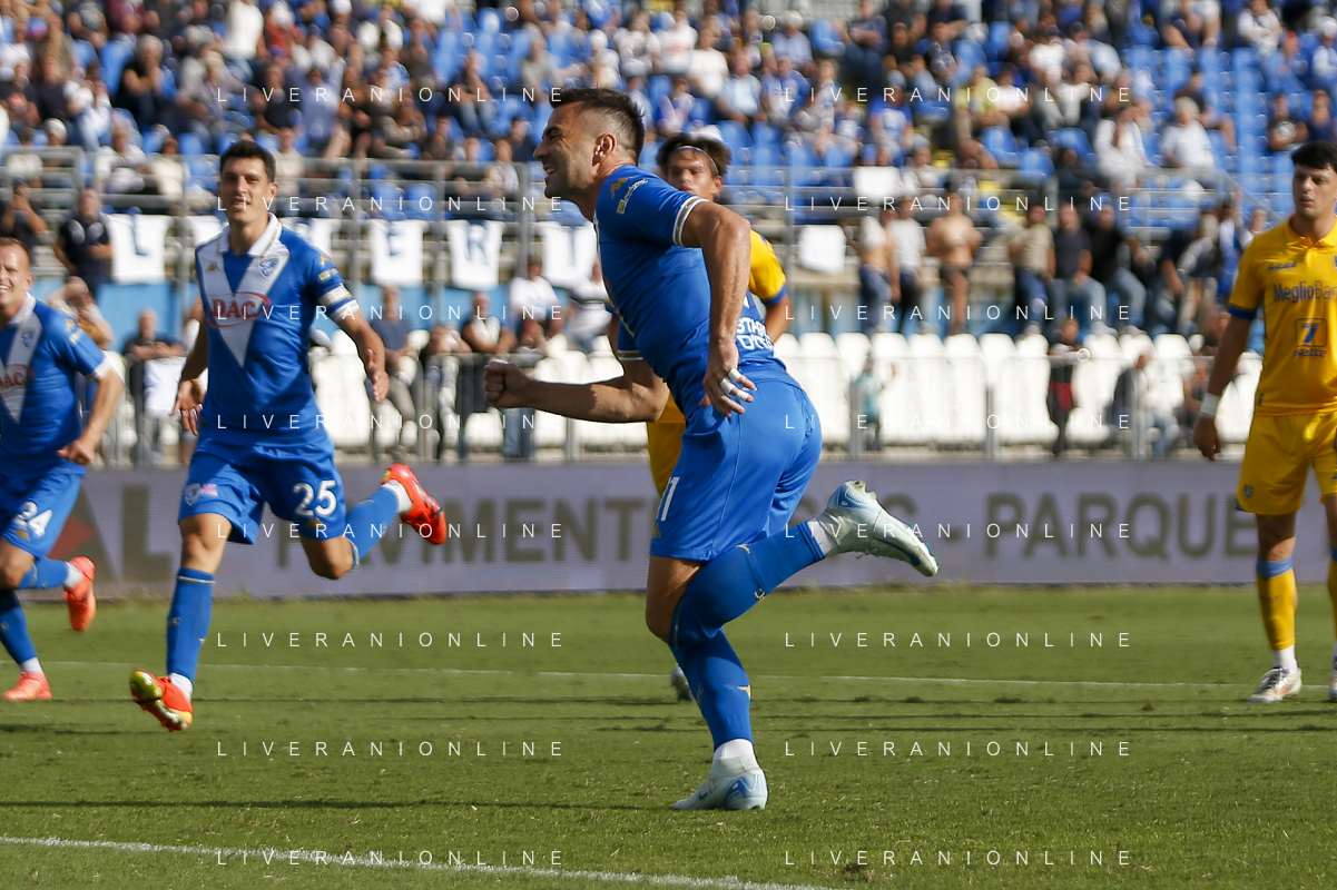 Ante Matej Juric of Brescia Calcio FC celebrates after scoring second goal during Brescia Calcio vs Frosinone Calcio, 5° Serie B BKT 2024-25 game at Mario Rigamonti stadium in Brescia (BS), Italy, on September 14, 2024. (Photo by Davide Casentini) ag aldo liverai sas