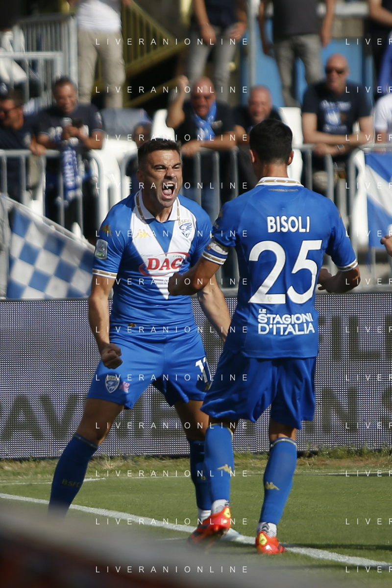 Gabriele Moncini of Brescia Calcio FC celebrates with Dimitri Bisoli of Brescia Calcio FC during Brescia Calcio vs Frosinone Calcio, 5° Serie B BKT 2024-25 game at Mario Rigamonti stadium in Brescia (BS), Italy, on September 14, 2024. (Photo by Davide Casentini)/AGENZIA ALDO LIVERANI SAS