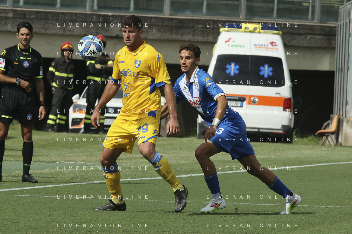 Giuseppe Ambrosino of Frosinone Calcio competes for the ball with Dimitri Bisoli of Brescia Calcio FC during Brescia Calcio vs Frosinone Calcio, 5° Serie B BKT 2024-25 game at Mario Rigamonti stadium in Brescia (BS), Italy, on September 14, 2024. (Photo by Davide Casentini)/AGENZIA ALDO LIVERANI SAS