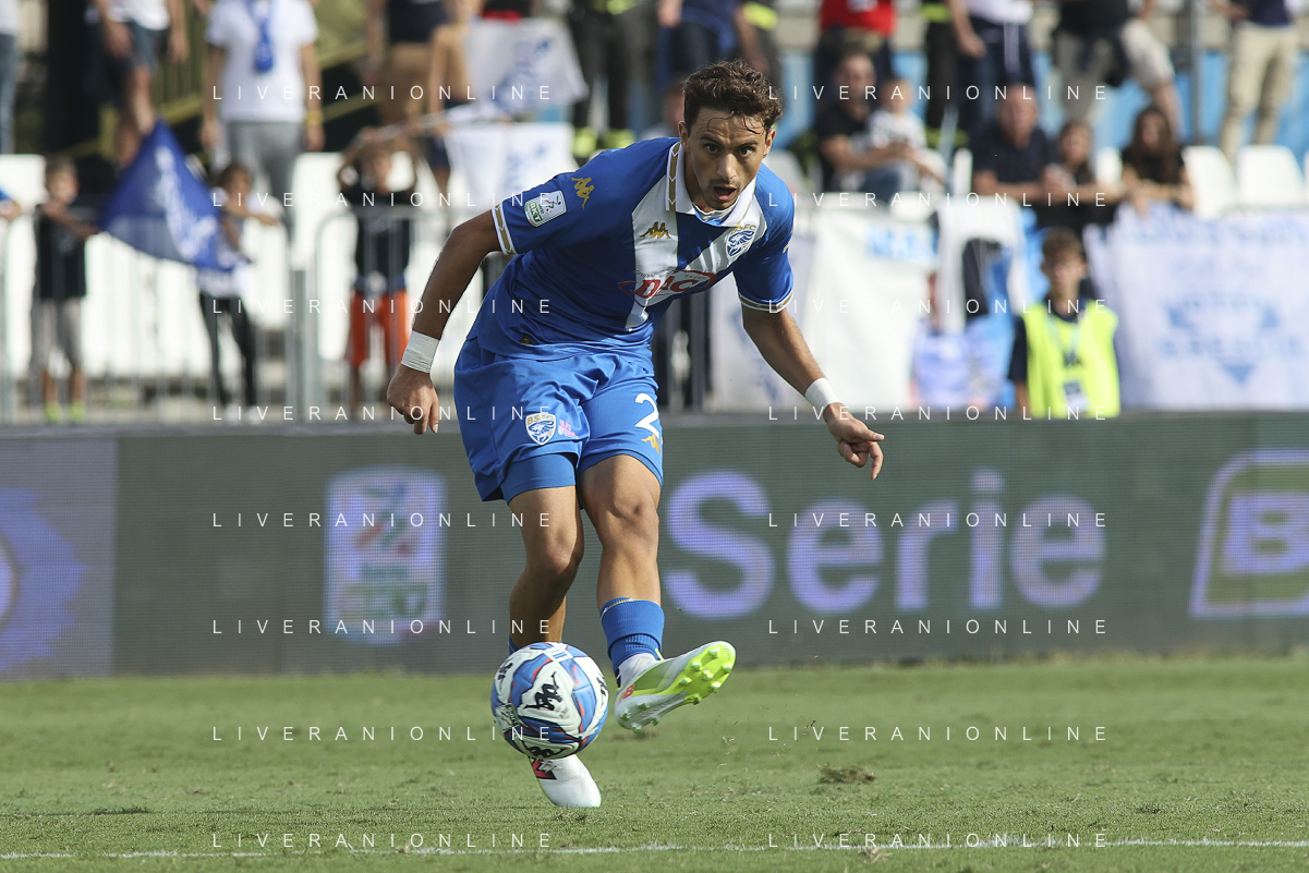 Niccolò Corrado of Brescia Calcio FC play the ball during Brescia Calcio vs Frosinone Calcio, 5° Serie B BKT 2024-25 game at Mario Rigamonti stadium in Brescia (BS), Italy, on September 14, 2024. (Photo by Davide Casentini)/AGENZIA ALDO LIVERANI SAS