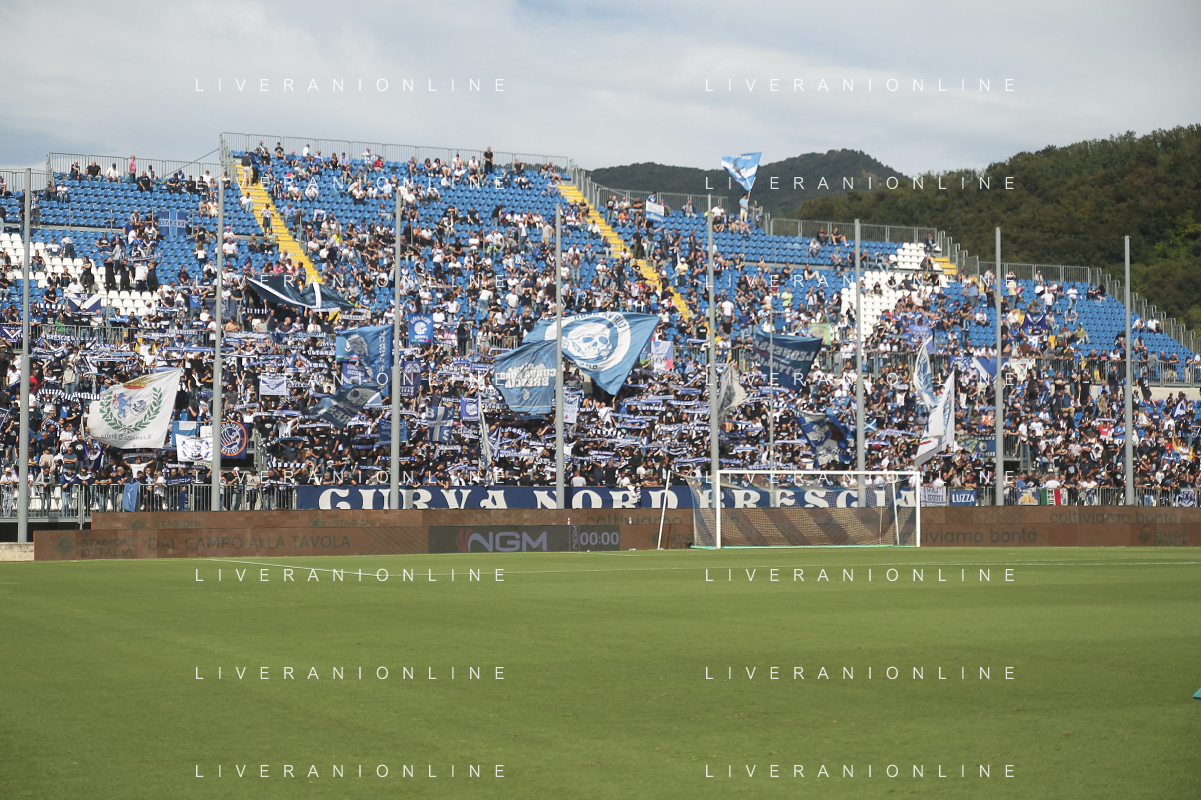 Brescia fans show their support during Brescia Calcio vs Frosinone Calcio, 5° Serie B BKT 2024-25 game at Mario Rigamonti stadium in Brescia (BS), Italy, on September 14, 2024. (Photo by Davide Casentini)/AGENZIA ALDO LIVERANI SAS