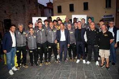 IMOLA 15 09 2024 VIRTUS IMOLA BASKET SERIE B1 PRESENTAZIONE DELLA SQUADRA ELIO'S CAFFE NELLA FOTO SQUADRA CON SINDACO MARCO PANIERI E PRESIDENTE DELLA VIRTUS IMOLA DAVIDE FIUMI ©SANNA/AGENZIA ALDO LIVERANI SAS