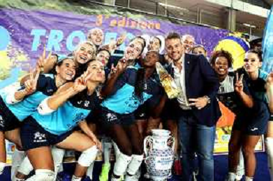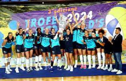 IMOLA 15 09 2024 LA SERIE A DI VOLLEY A IMOLA "TROFEO MC DONALD'S" FINALE BISONTE FIRENZE-ROMA VOLLEY 3-0 NELLA FOTO SINDACO DI IMOLA MARCO PANIERI E LA SQUADRA IL BISONTE FIRENZE CON LA COPPA VINTA ©SANNA/AGENZIA ALDO LIVERANI SAS