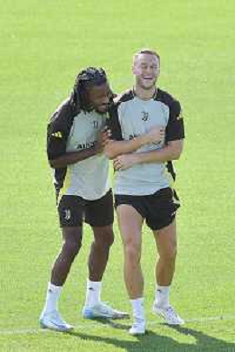 TVMV-Torino 16.09.2024 Continassa © Manuela Viganti/Agenzia Aldo Liverani Allenamento Juventus Rifinitura partita Champions League Juventus Psv Nella foto: kheprhen thuram e teun koopmainers ©Viganti/AGENZIA ALDO LIVERANI SAS