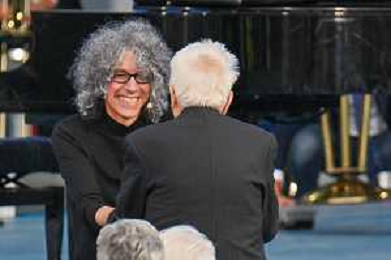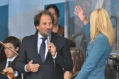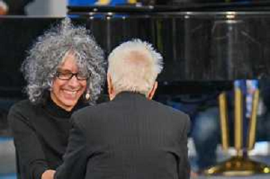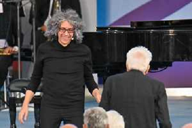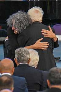 16-9-2024. Il presidente della Repubblica Italiana Sergio Mattarella e il ministro dell'istruzione Giuseppe Valditara, presenziano la 24esima edizione di tutti a scuola. Si terrà innaugurazione anno scolastico 2024/2025, presso Convitto Nazionale "Vittorio Emanuele II", in via Pintus a Cagliari. Foto Salvatore Moi/Agenzia Aldo Liverani s.as. Nella foto: Giovannio Allevi saluta e abbraccia Sergio Mattarella presidente Repubblica itliana