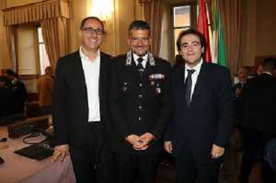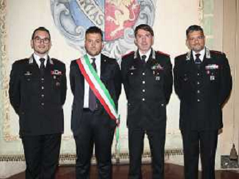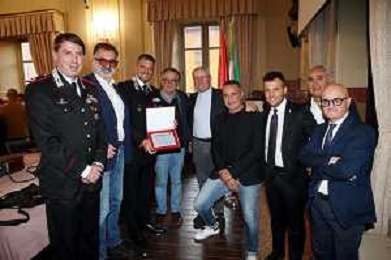 IMOLA 16 09 2024 MAGGIORE DEI CARABINIERI ANDREA OXILIA SALUTA LA CITTA' PER UN NUOVO INCARICO LAVORATIVO NELLA FOTO MAGGIORE ANDREA OXILIA CON PRESIDENTE DEL CONSIGLIO COMUNALE ROBERTO VISANI E VICE PRESIDENTE NICHOLAS VACCHI FOTO GIANNI SANNA-AG ALD LIVERANI SAS