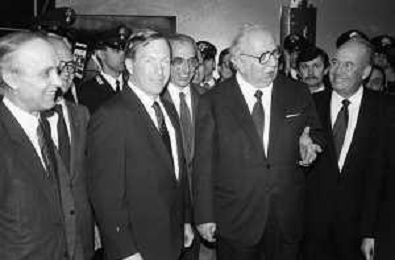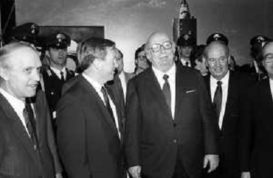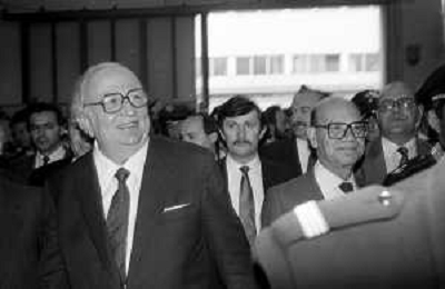 Neg- RETROSPETTIVA GIOVANNI SPADOLINI POLITICO NELLA FOTO GIOVANNI SPADOLINI CON IL PRESIDENTE ENTE FIERA DI MILANO VINCENZO VICARI NELL’ANNO 1988 AG ALDO LIVERANI SAS
