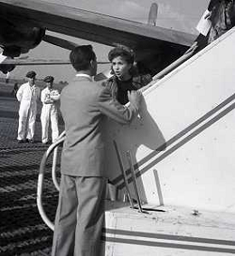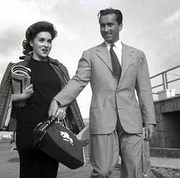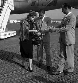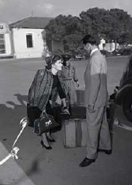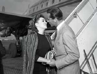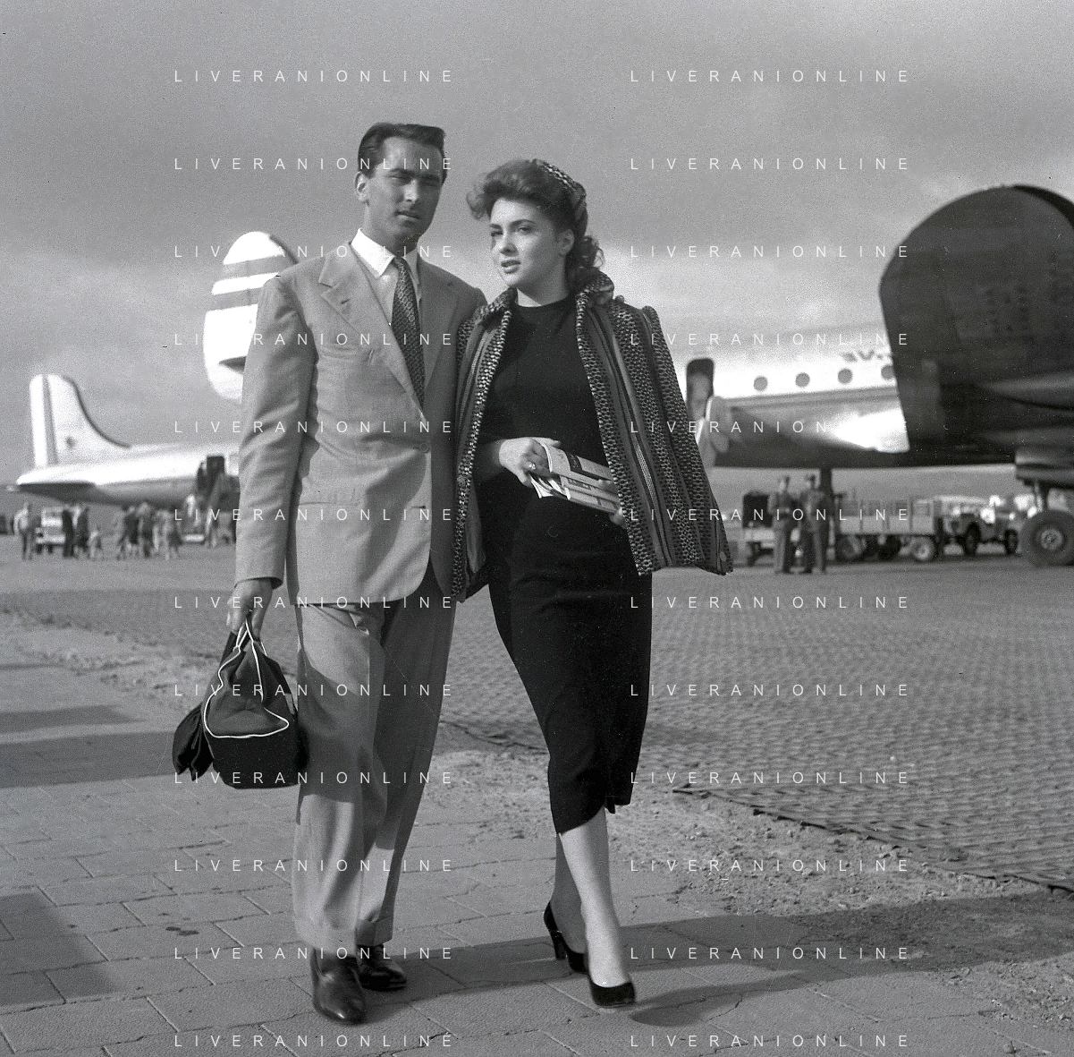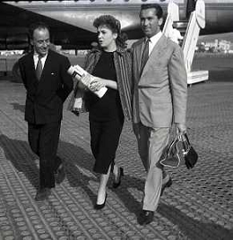 NEG-RETROSPETTIVA GINA LOLLOBRIGIDA ATTRICE NELLA FOTO GINA LOLLOBRIGIDA CON IL MARITO MILKO SKOFIC IN AEROPORTO A CIAMPINO ROMA ANNI 1950 AG ALDO LIVERANI SAS