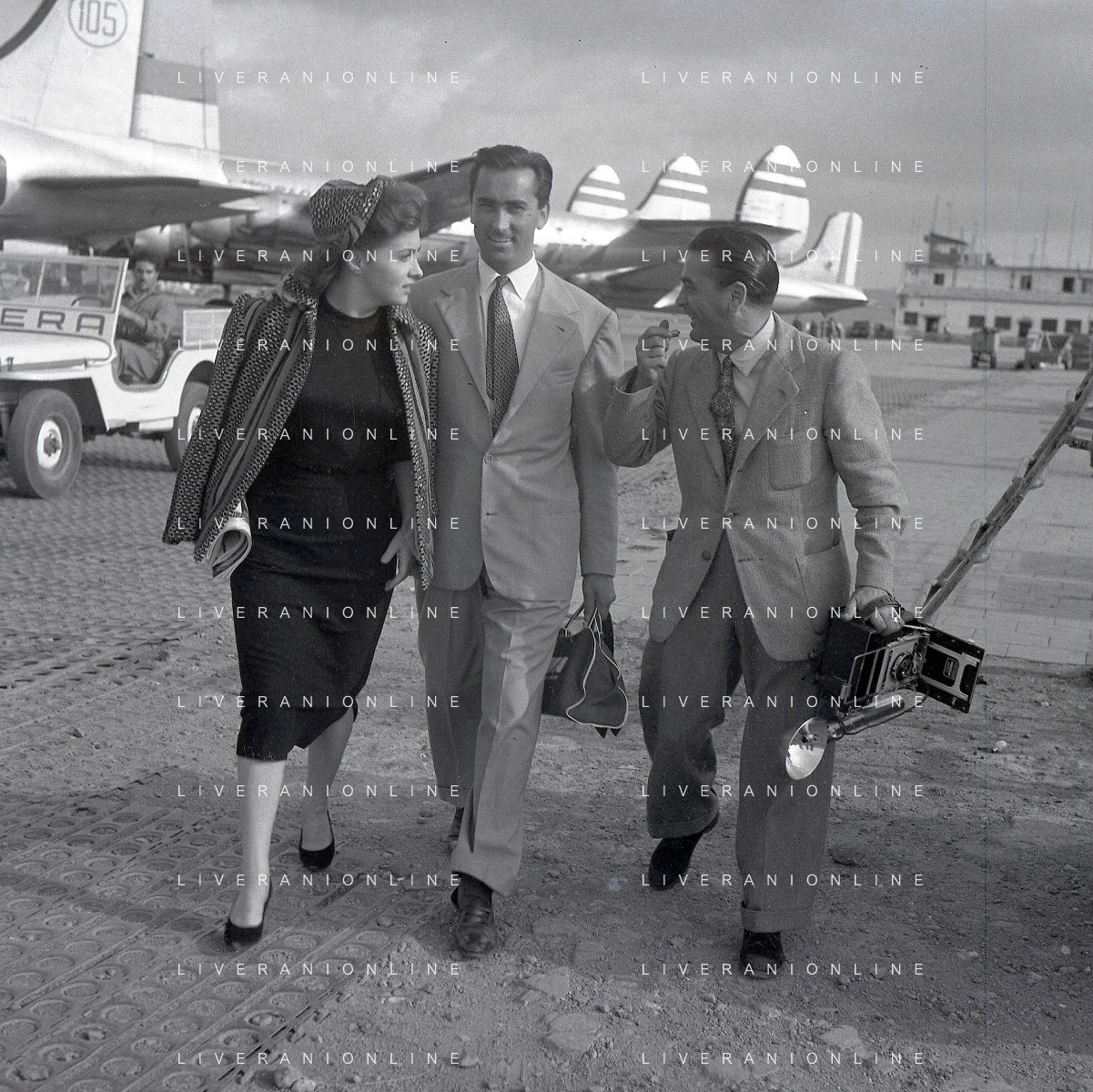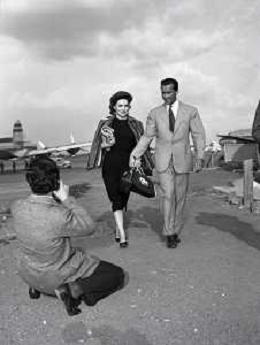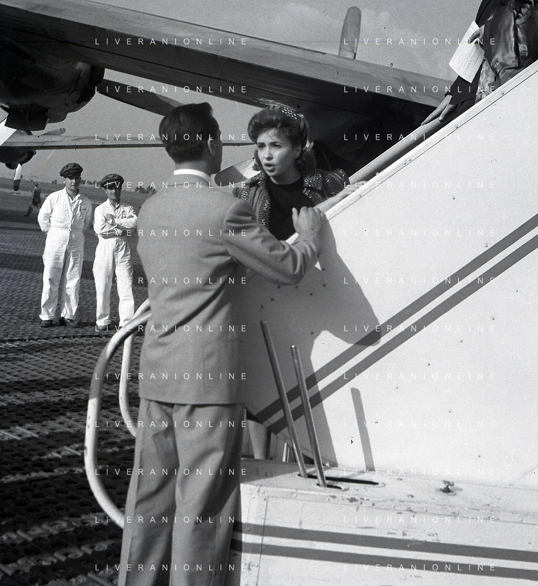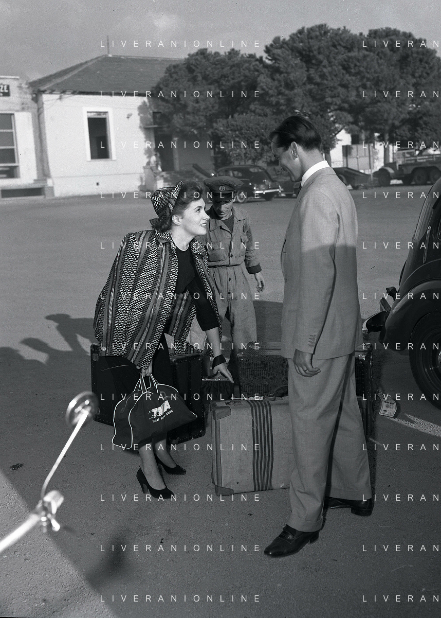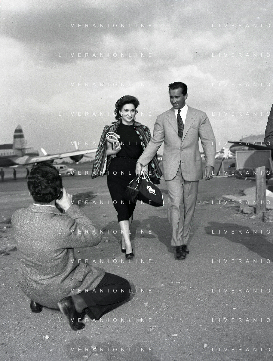 NEG-RETROSPETTIVA GINA LOLLOBRIGIDA ATTRICE NELLA FOTO GINA LOLLOBRIGIDA CON IL MARITO MILKO SKOFIC IN AEROPORTO A CIAMPINO ROMA ANNI 1950 COL FOTOGRAFO SANDRO VESPASIANI AG ALDO LIVERANI SAS