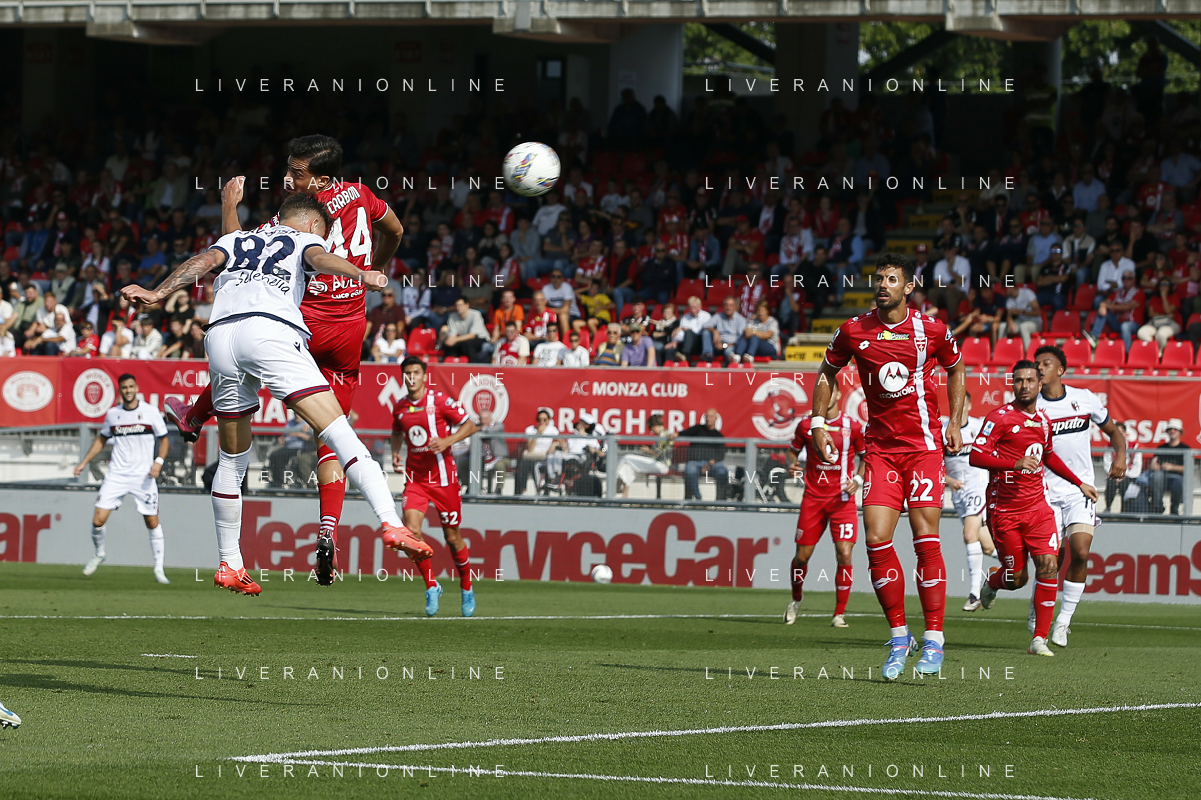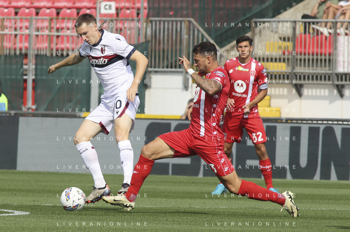 Pedro Pereira of AC Monza competes for the ball with Michel Aebischer of Bologna FC during AC Monza vs Bologna BFC, 5° Serie A Enilive 2024-25 game at U-Power stadium in Monza (MB), Italy, on September 22, 2024. (Photo by Davide Casentini)/AGENZIA ALDO LIVERANI SAS
