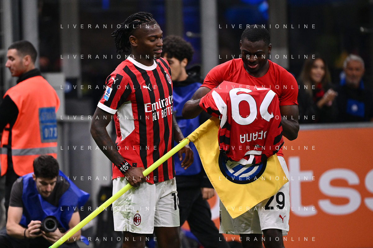 Inter vs Milan nella foto Rafael Leao (Milan) e Youssouf Fofana (Milan) a fine gara coprono lo stemma dell'Inter con una maglia del Milan Milano 22-09-2024 Stadio Giuseppe Meazza - San Siro Campionato Serie A Enilive - 5a giornata foto Roberto Garavaglia/Agenzia Aldo Liverani sas/AGENZIA ALDO LIVERANI SAS