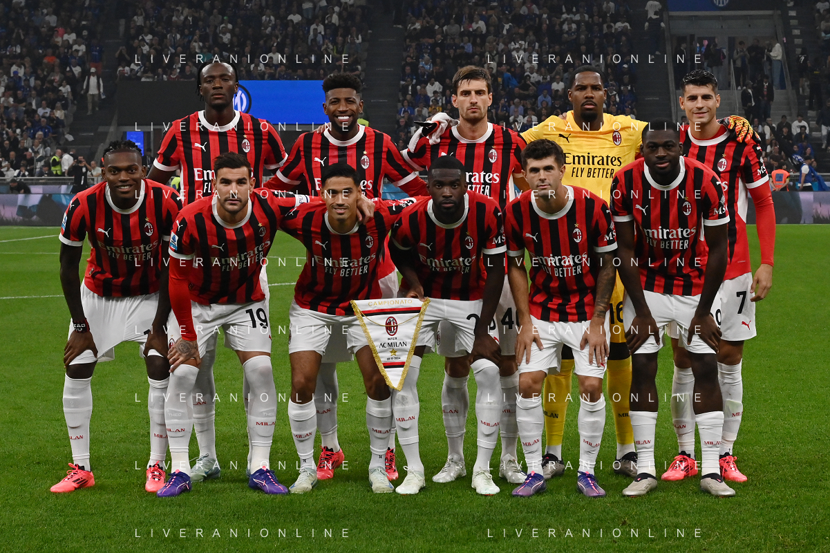 Inter vs Milan nella foto formazione Milan, in piedi da SX Tammy Abraham, Emerson Royal, Matteo Gabbia, Mike Maignan e Alvaro Morata; in basso da SX Rafael Leao, Theo Hernandez, Tijjani Reijnders, Fikayo Tomori, Christian Mate Pulisic e. Youssouf Fofana Milano 22-09-2024 Stadio Giuseppe Meazza - San Siro Campionato Serie A Enilive - 5a giornata foto Roberto Garavaglia/Agenzia Aldo Liverani sas/AGENZIA ALDO LIVERANI SAS