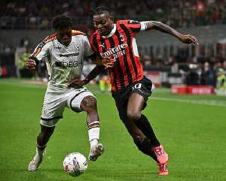 Milan vs Lecce nella foto Patrick Dorgu (Lecce) e Rafael Leao (Milan) Milano 27-09-2024 Stadio Giuseppe Meazza - San Siro Campionato Serie A Enilive - 6a giornata foto Roberto Garavaglia/Agenzia Aldo Liverani sas/AGENZIA ALDO LIVERANI SAS