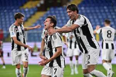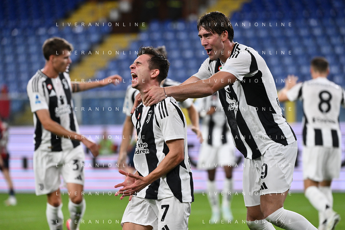 Genoa vs Juventus nella foto Francisco Conceicao (Juventus) SX e Dusan Vlahovic (Juventus) DX esultanza dopo il gol del 3 a 0 Genova 28-09-2024 Stadio Luigi Ferraris - Marassi Campionato Serie A Enilive - 6a giornata foto Roberto Garavaglia/Agenzia Aldo Liverani sas