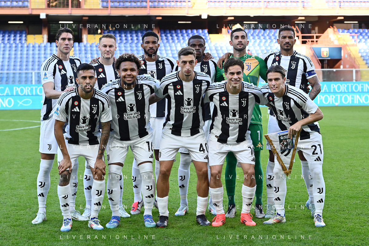 Genoa vs Juventus nella foto formazione Juventus, in piedi da SX Dusan Vlahovic, Teun Koopmeiners, Gleison Bremer, Pierre Kalulu, Mattia Perin e Danilo Luiz Da Silva; in basso da SX Nicolas Gonzalez, Weston McKennie, Jonas Rouhi, Kenan Yildiz e Nicolo' Fagioli Genova 28-09-2024 Stadio Luigi Ferraris - Marassi Campionato Serie A Enilive - 6a giornata foto Roberto Garavaglia/Agenzia Aldo Liverani sas