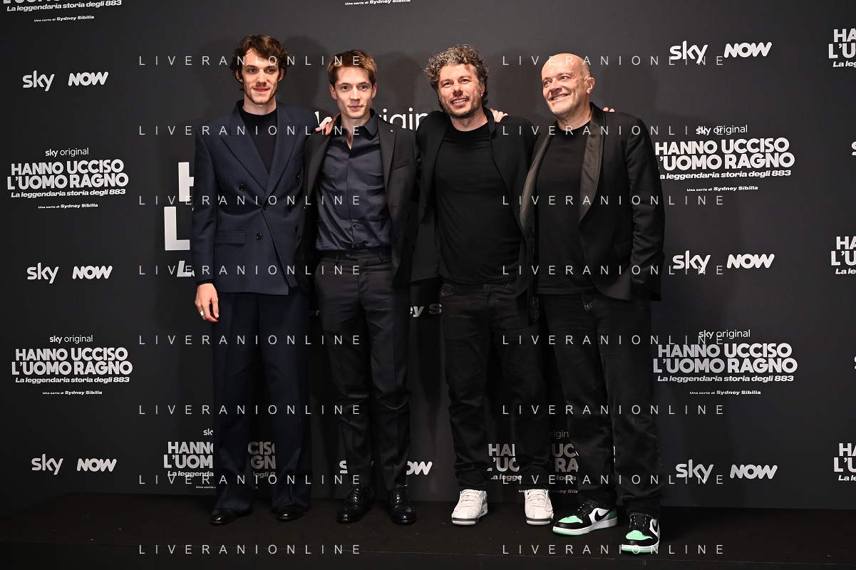 TVRG Photocall Hanno Ucciso Uomo Ragno nella foto da SX Matteo Oscar Giuggioli, Eliza Nuzzolo, Sydney Sibilia e Max Pezzali Milano 03-10-2024 Photocall in occasione della presentazione della serie TV Hanno Ucciso l'Uomo Ragno foto Roberto Garavaglia/Agenzia Aldo Liverani sas