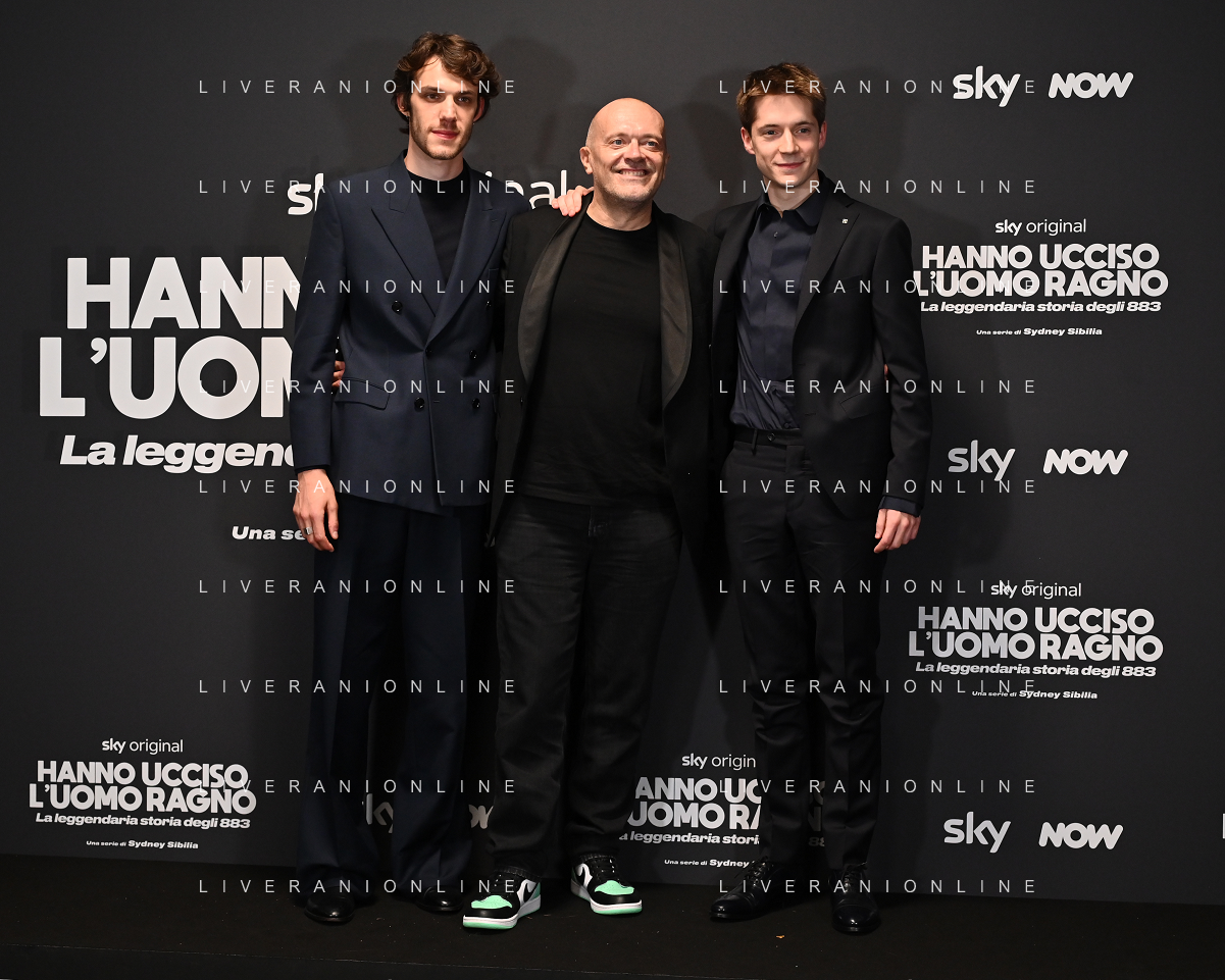 TVRG Photocall Hanno Ucciso Uomo Ragno nella foto da SX Matteo Oscar Giuggioli, Max Pezzali ed Elia Nuzzolo Milano 03-10-2024 Photocall in occasione della presentazione della serie TV Hanno Ucciso l'Uomo Ragno foto Roberto Garavaglia/Agenzia Aldo Liverani sas