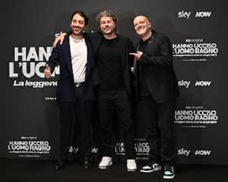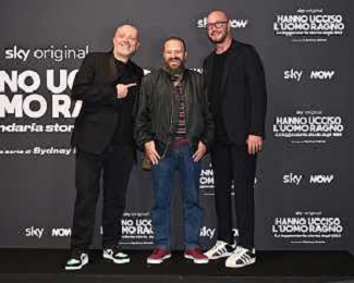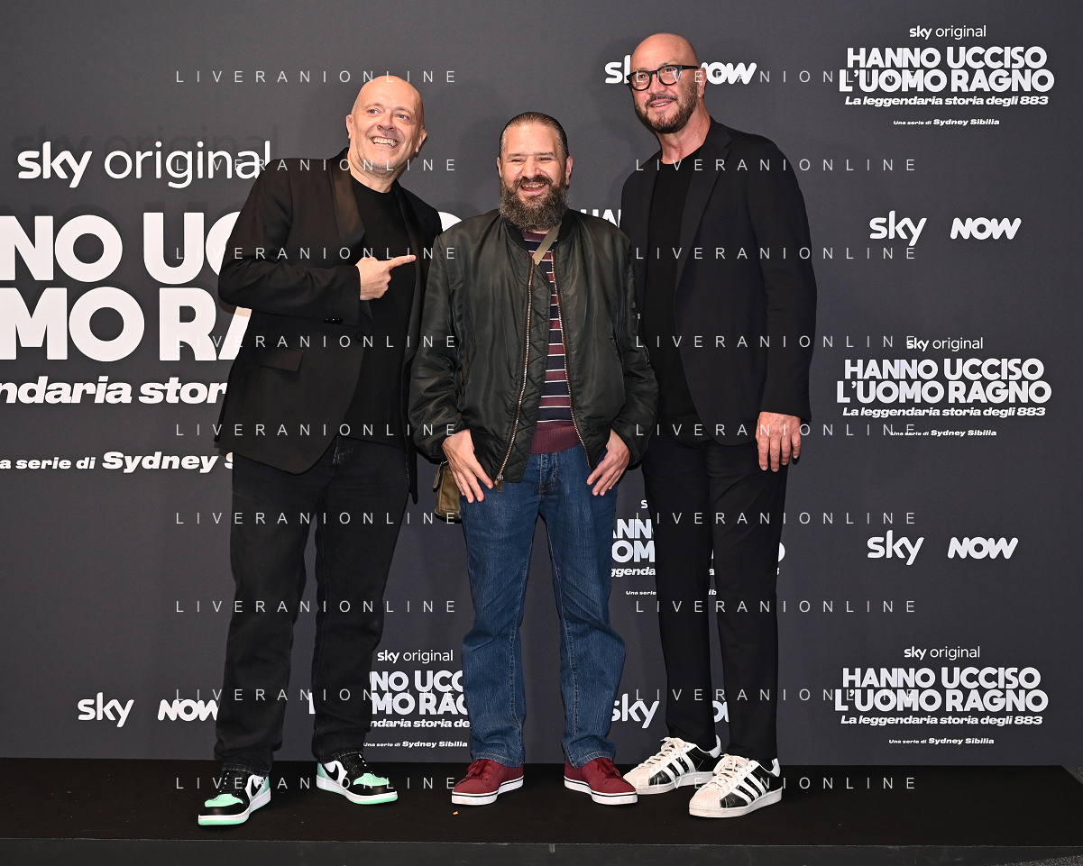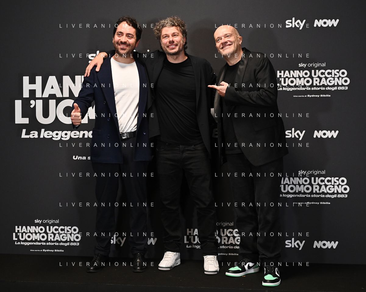 TVRG Photocall Hanno Ucciso Uomo Ragno nella foto da SX Matteo Rovere, Sydney Sibilia e Max Pezzali Milano 03-10-2024 Photocall in occasione della presentazione della serie TV Hanno Ucciso l'Uomo Ragno foto Roberto Garavaglia/Agenzia Aldo Liverani sas