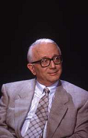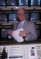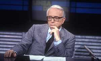 RETROSPETTIVA ENZO BIAGI GIORNALISTA E SCRITTORE E CONDUTTORE TELEVISIVO NELLA FOTO ENZO BIAGI NELLA TRASMISSIONE TELEVISIVA “LINEA DIRETTA“NELL'ANNO 1985 AG ALDO LIVERANI SAS