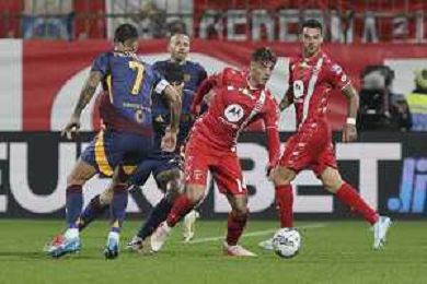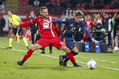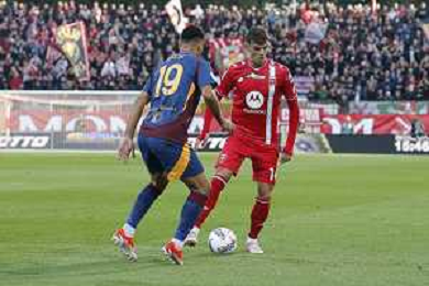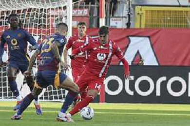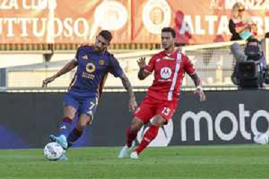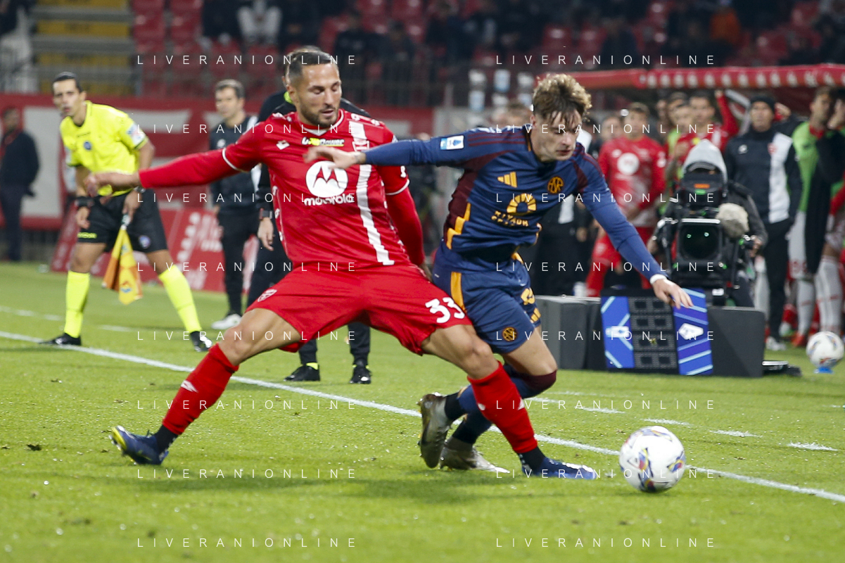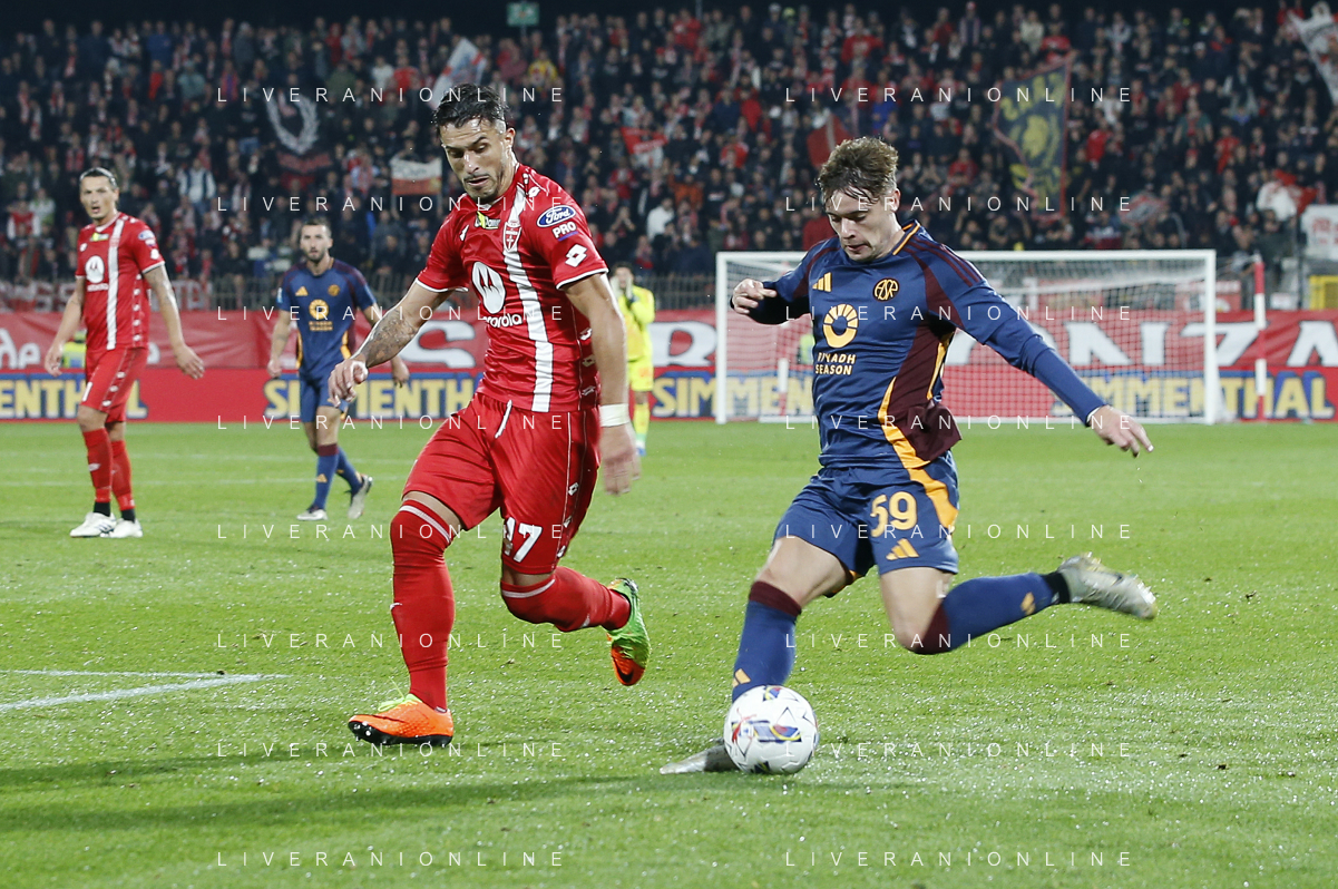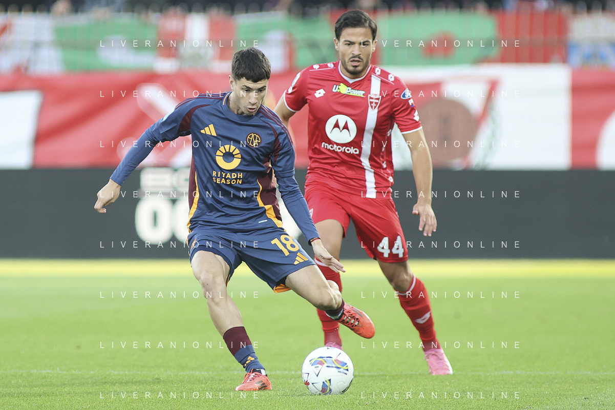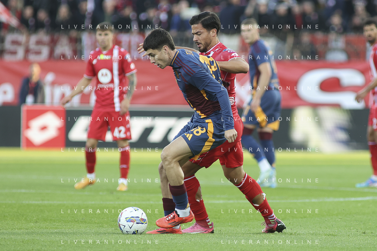 Matías Soulé of AS Roma competes for the ball with Andrea Carboni of AC Monza during AC Monza vs AS Roma, 7° Serie A Enilive 2024-25 game at U-Power stadium in Monza (MB), Italy, on October 06, 2024. (Photo by Davide Casentini) ag aldo liverani sas