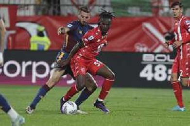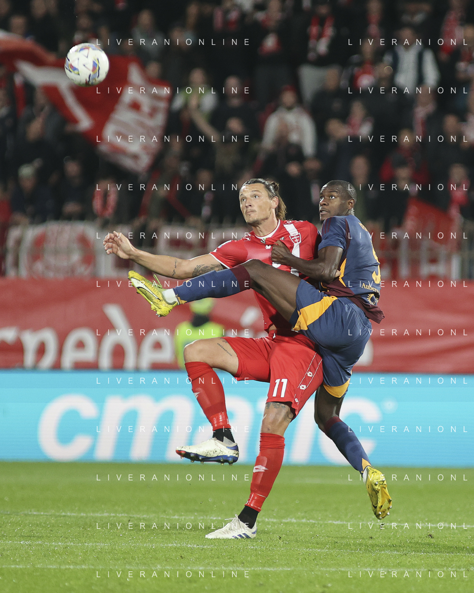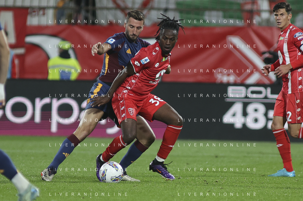 Warren Bondo of AC Monza competes for the ball with Bryan Cristante of AS Roma during AC Monza vs AS Roma, 7° Serie A Enilive 2024-25 game at U-Power stadium in Monza (MB), Italy, on October 06, 2024. (Photo by Davide Casentini) ag aldo liverani sas