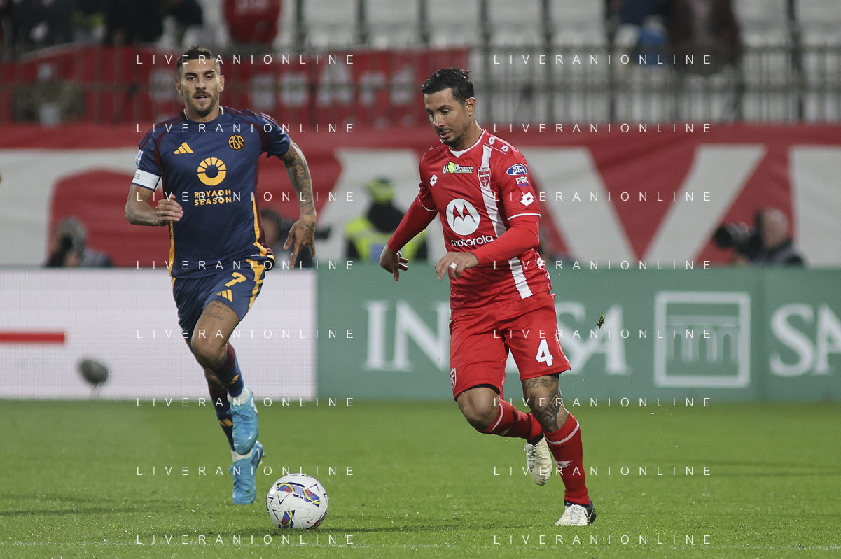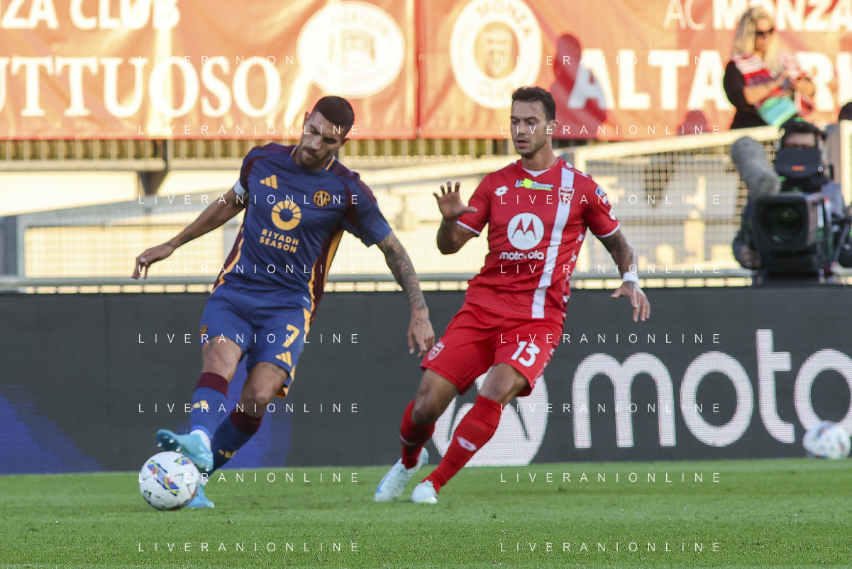 Lorenzo Pellegrini of AS Roma competes for the ball with Pedro Pereira of AC Monza during AC Monza vs AS Roma, 7° Serie A Enilive 2024-25 game at U-Power stadium in Monza (MB), Italy, on October 06, 2024. (Photo by Davide Casentini) ag aldo liverani sas