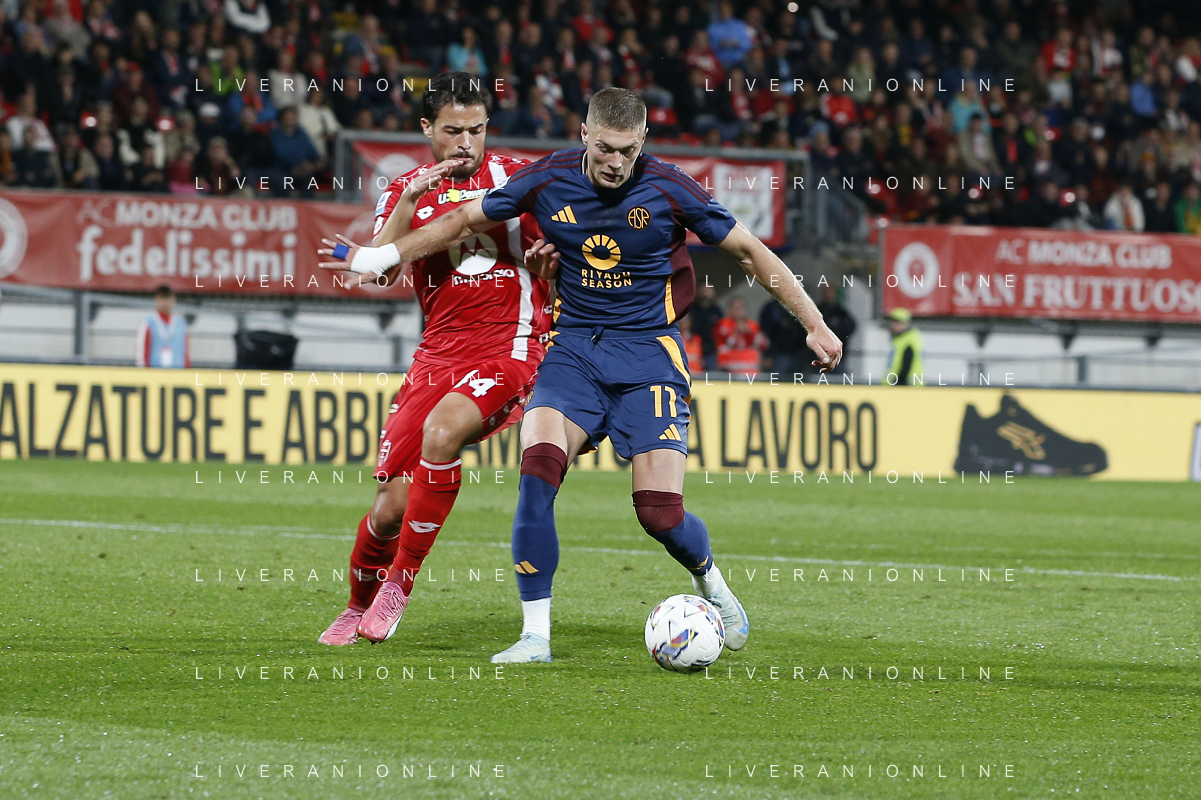 Nicola Zalewski of AS Roma competes for the ball with Dany Mota Carvalho of AC Monza during AC Monza vs AS Roma, 7° Serie A Enilive 2024-25 game at U-Power stadium in Monza (MB), Italy, on October 06, 2024. (Photo by Davide Casentini) ag aldo liverani sas