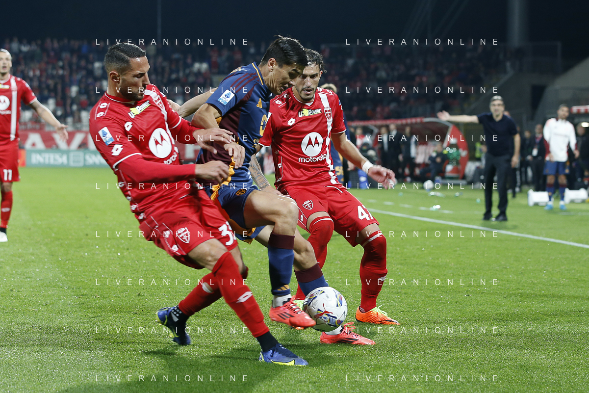 Eldor Shomurodov of AS Roma battle for the ball with Danilo D'Ambrosio of AC Monza and Dany Mota Carvalho of AC Monza during AC Monza vs AS Roma, 7° Serie A Enilive 2024-25 game at U-Power stadium in Monza (MB), Italy, on October 06, 2024. (Photo by Davide Casentini) ag aldo liverani sas