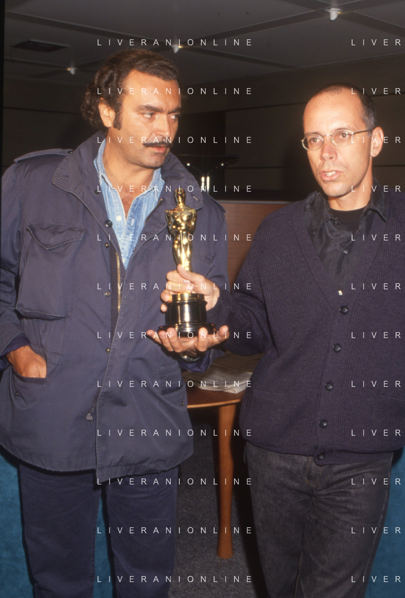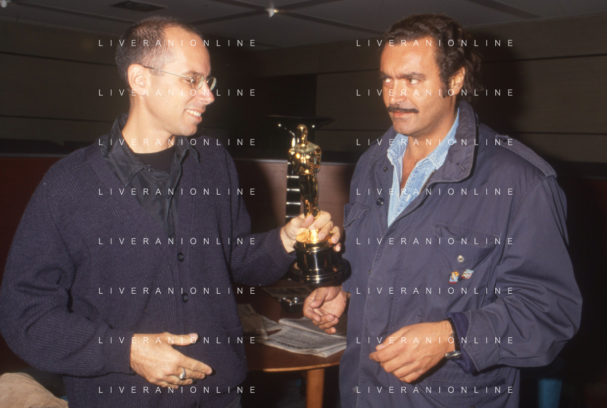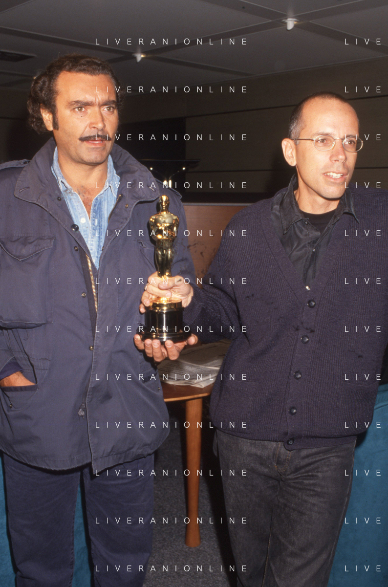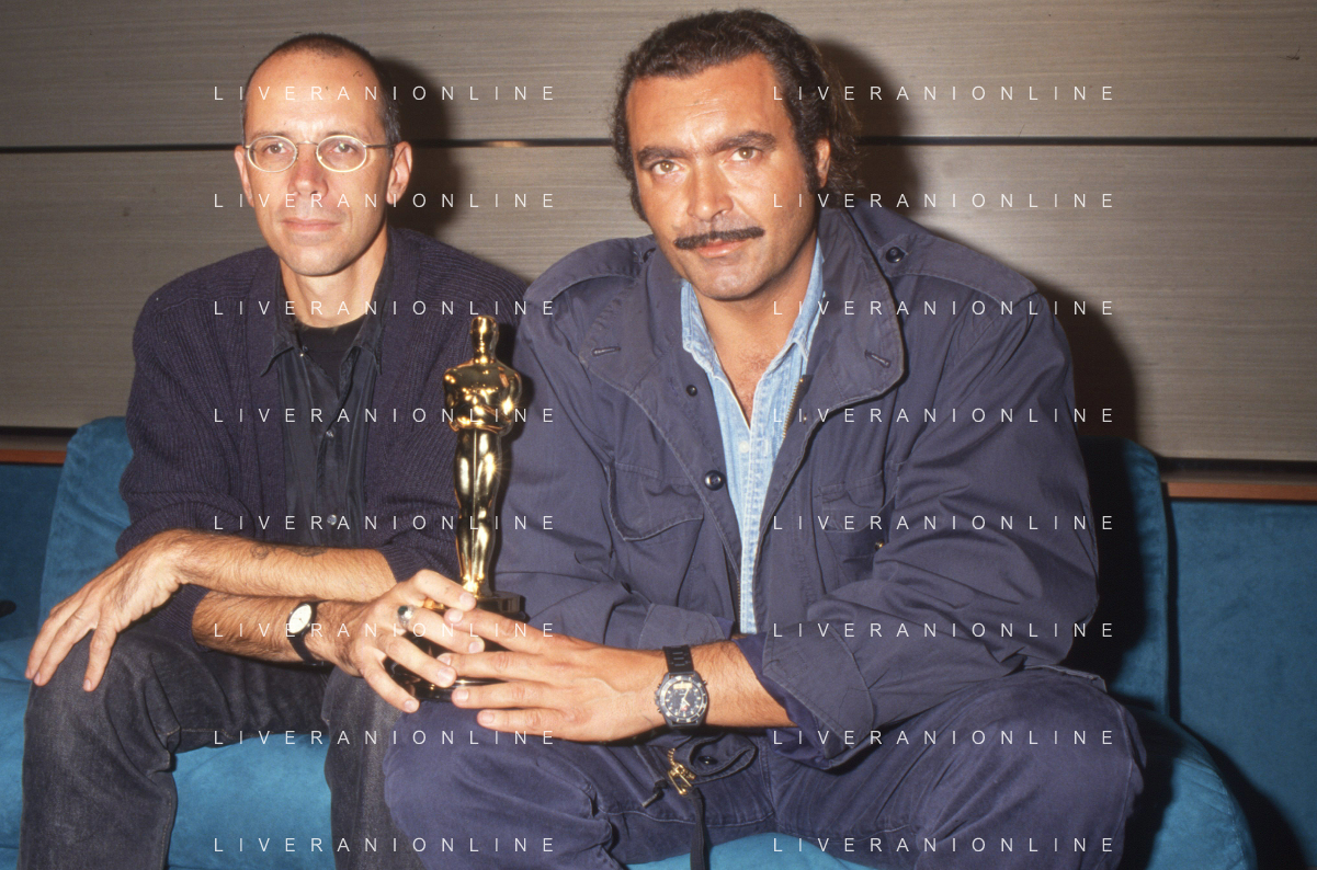 DIAP-RETROSPETTIVA DIEGO ABATANTUONO ATTORE NELLA FOTO DIEGO ABATANTUONO CON GABRIELE SALVATORES CON LA STATUETTA DELL'OSCAR PER IL FILM “MEDITERRANEO “ANNO 1991 AG ALDO LIVERANI SAS