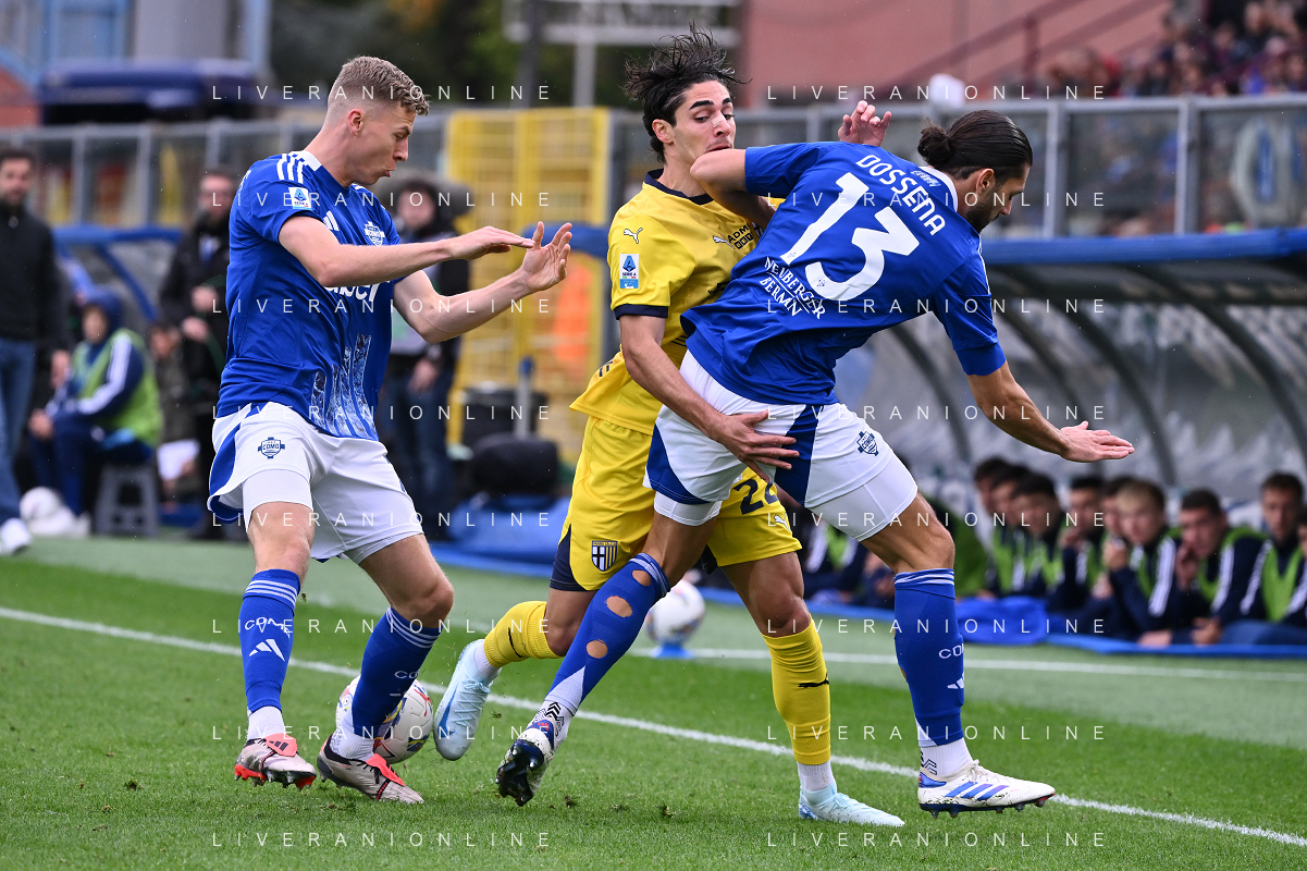 TVRG Como vs Parma nella foto Matteo Cancellieri (Parma) tra Ignace Van der Brempt (Como) e Alberto Dossena (Como) Como 19-10-2024 Stadio Giuseppe Sinigaglia Campionato Serie A Enilive - 8a giornata foto Roberto Garavaglia/Agenzia Aldo Liverani sas