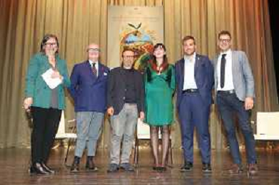 IMOLA 19 10 2024 TEATRO EBE STIGNANI INAUGURAZIONE BACCANALE 2024 "OLIO" NELLA FOTO DA SINISTRA LIDIA MASTROIANNI DEL COMUNE,ASSESSORE PIERANGELO RAFFINI,PROF MASSIMO MONTANARI,DISEGNATRICE DEL MANIFESTO CHIARA FARCELLA,SINDACO MARCO PANIERI E ASSESSORE ALLA CULTURA GIACOMO GAMBI FOTO GIANNI SANNA-AG ALDO LIVERANI SAS