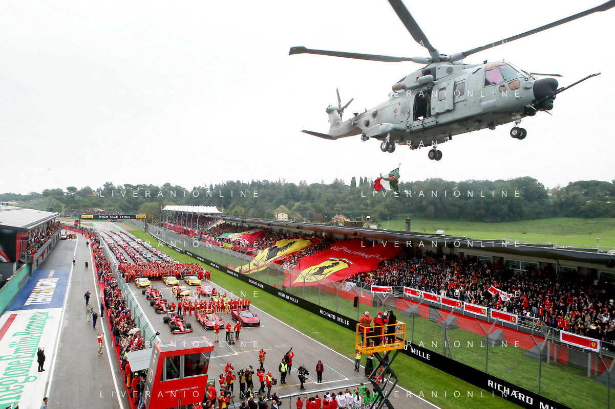 IMOLA 20 10 2024 AUTODROMO ENZO E DINO FERRARI FINALI MONDIALI 2024 FERRARI NELLA FOTO FOTO UFFICIALE DELLA FERRARI CON IL PUBBLICO E IL SALUTO DELL'ELICOTTERO CON LA BANDIERA ITALIANA DELL'AEREONATUTICA MILITARE FOTO GIANNI SANNA-AG ALDO LIVERANI SAS