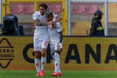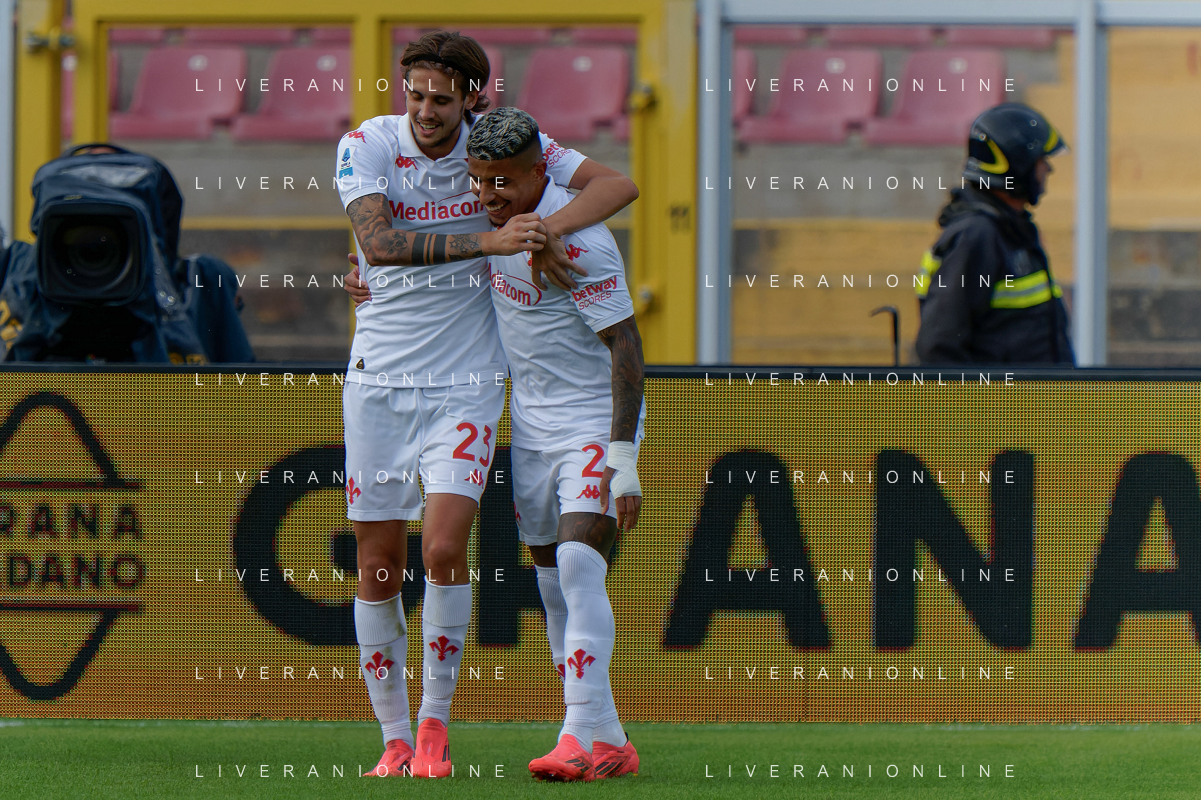 TVEM October 20, 2024 Lecce, Italy - US Lecce vs ACF Fiorentina - Italian soccer serie A 2024/25 - Via Del Mare Stadium. In the pic: Andrea Colpani of Fiorentina celebrates after scoring a goal with Dodo of Fiorentina foto emmanuele mastrodonato-ag aldo liverani sas