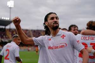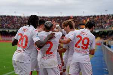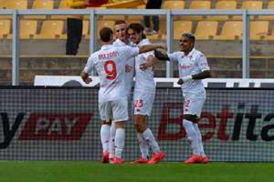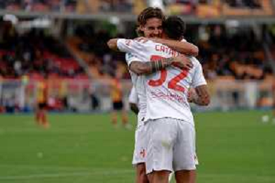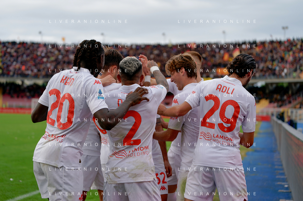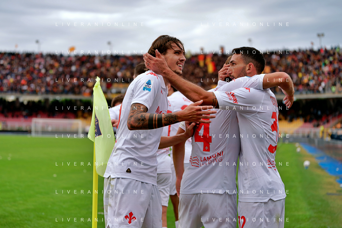 TVEM October 20, 2024 Lecce, Italy - US Lecce vs ACF Fiorentina - Italian soccer serie A 2024/25 - Via Del Mare Stadium. In the pic: Andrea Colpani of Fiorentina celebrates after scoring a goal with teammates foto emmanuele mastrodonato-ag aldo liverani sas