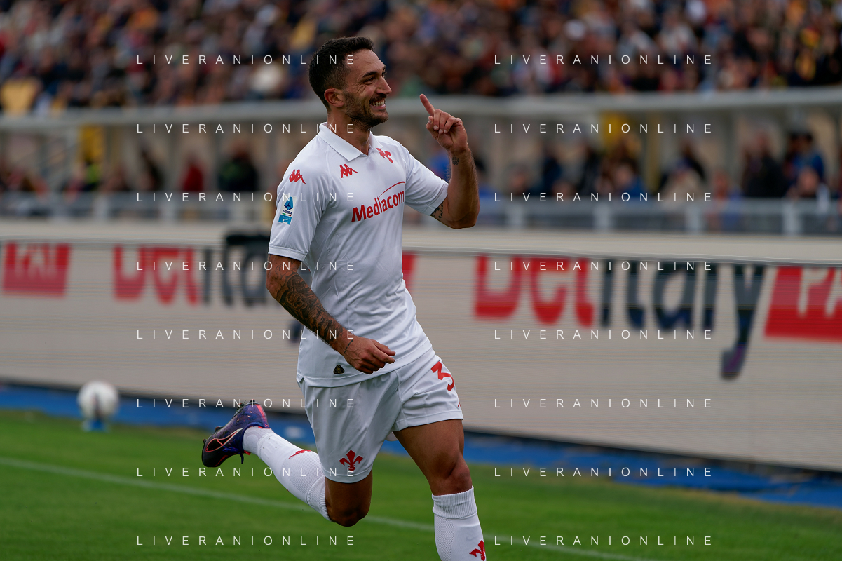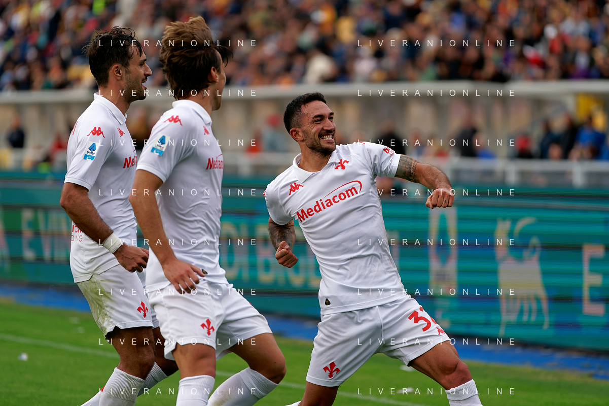 TVEM October 20, 2024 Lecce, Italy - US Lecce vs ACF Fiorentina - Italian soccer serie A 2024/25 - Via Del Mare Stadium. In the pic: Fabiano Parisi of Fiorentina celebrates after scoring a goal foto emmanuele mastrodonato-ag aldo liverani sas