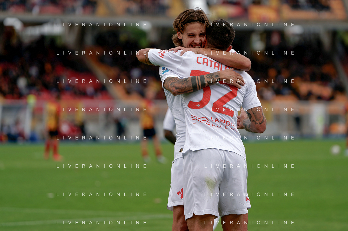 TVEM October 20, 2024 Lecce, Italy - US Lecce vs ACF Fiorentina - Italian soccer serie A 2024/25 - Via Del Mare Stadium. In the pic: Danilo Cataldi of Fiorentina celebrates after scoring a goal with Andrea Colpani of Fiorentina foto emmanuele mastrodonato-ag aldo liverani sas