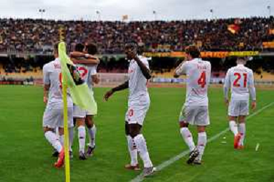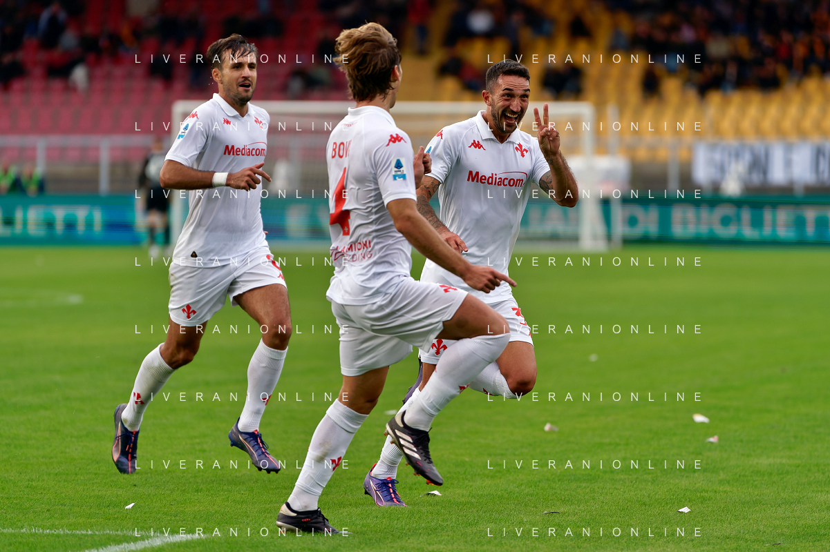 TVEM October 20, 2024 Lecce, Italy - US Lecce vs ACF Fiorentina - Italian soccer serie A 2024/25 - Via Del Mare Stadium. In the pic: Fabiano Parisi of Fiorentina celebrates after scoring a goal with teammates foto emmanuele mastrodonato-ag aldo liverani sas